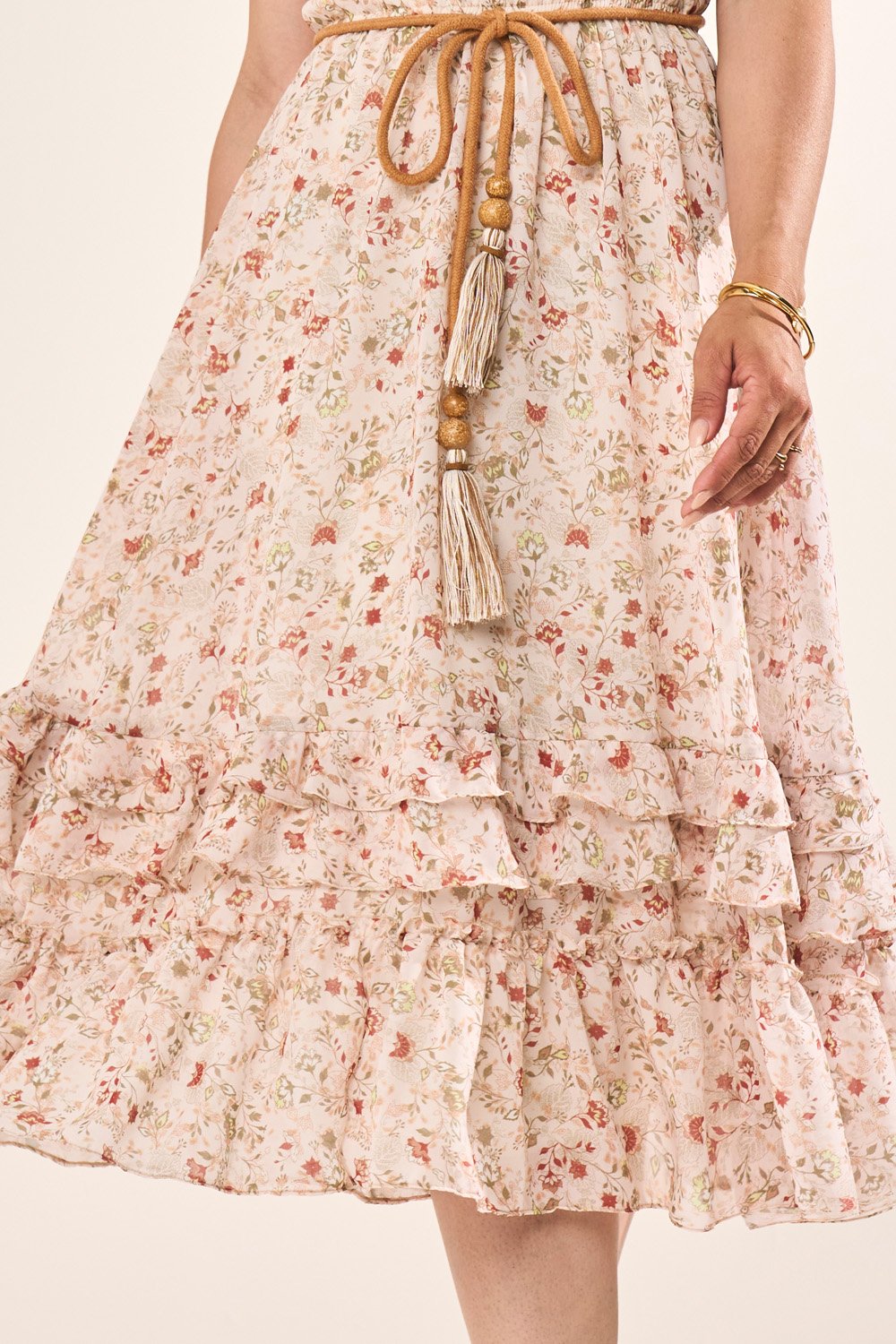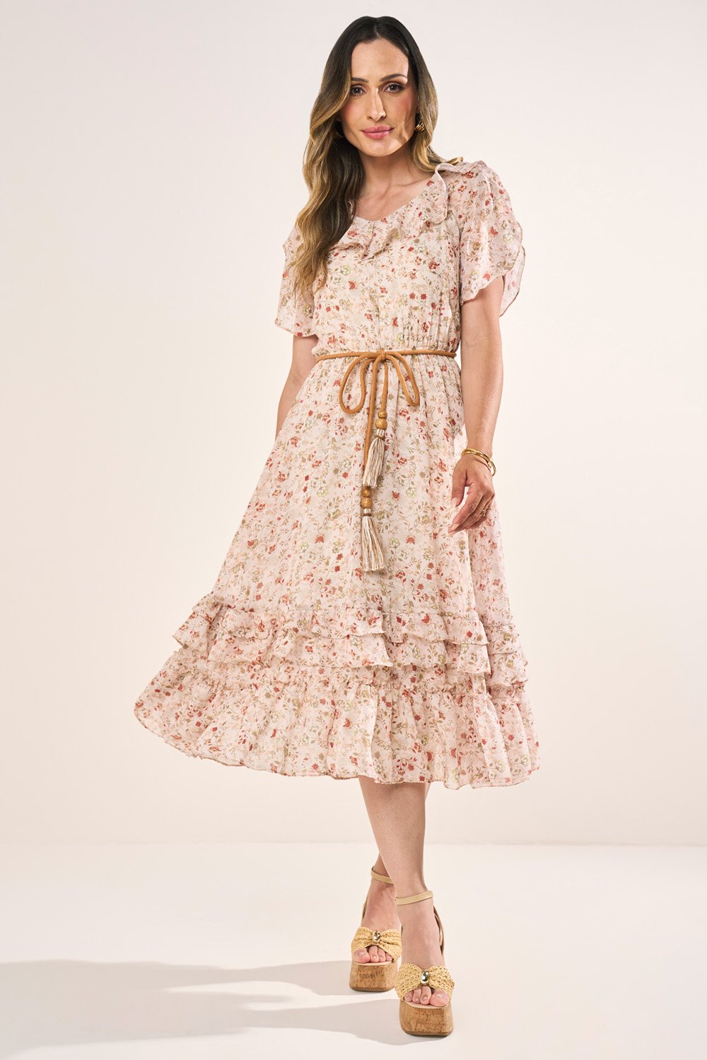 O vestido acompanha cordão exclusivo com ponteiras de madeira e pompons, que traz um toque artesanal e descontraído ao look. A combinação de babados, amarração e acessórios transforma o modelo em uma peça charmosa e versátil. Perfeito para quem busca delicadeza com estilo marcante.