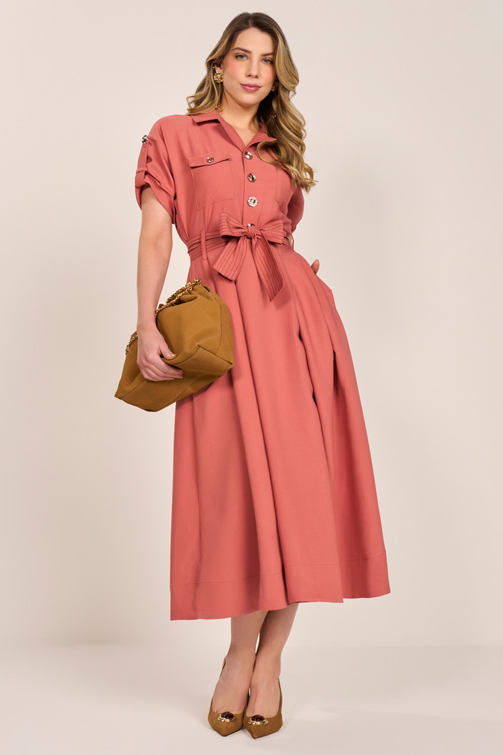 Elegante com toque utilitário, esse vestido reúne alfaiataria e feminilidade em uma só peça. Os bolsos estilo cargo e os botões dourados reforçam o estilo contemporâneo, enquanto as mangas com martingale e a saia com pregas trazem sofisticação. Acompanha cinto faixa com pespontos que destaca a cintura com equilíbrio entre estrutura e delicadeza.