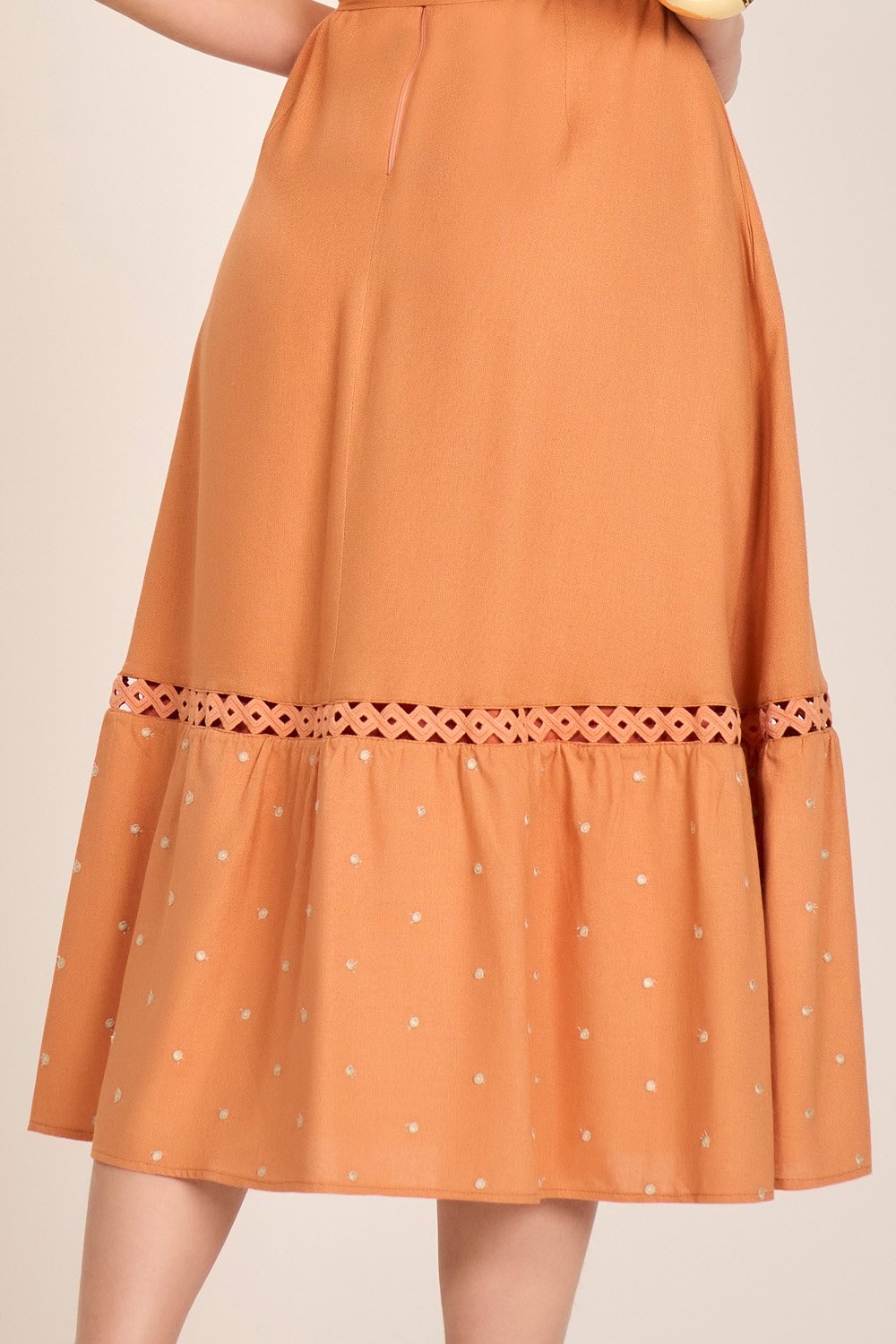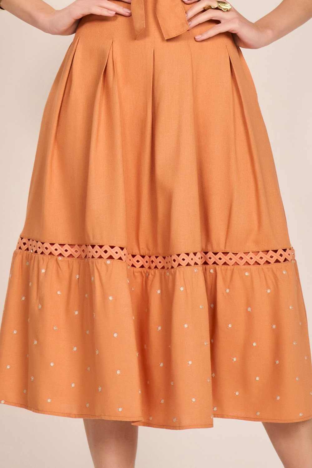 Feito em linho com bordados em poá, o tecido apresenta textura charmosa e acabamento sofisticado. Seu toque é agradável e o caimento confere estrutura sem perder a leveza. A peça é forrada na medida certa para conforto e elegância em qualquer ocasião.