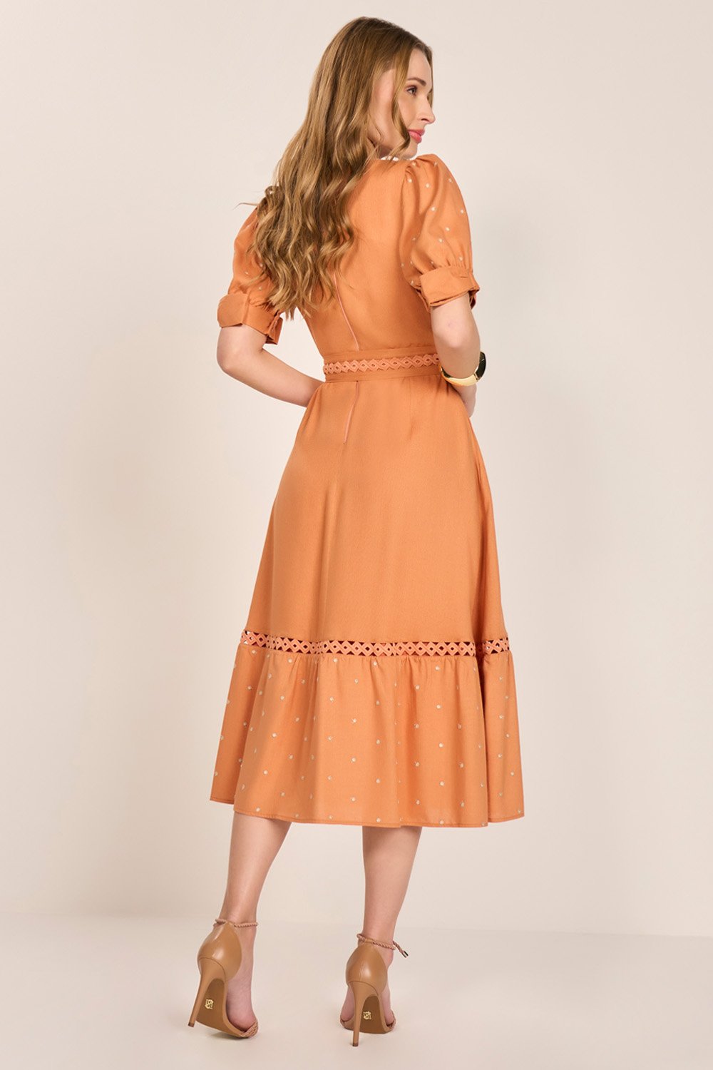 Este vestido é a definição de elegância romântica. As mangas levemente bufantes com laço nos punhos trazem delicadeza, enquanto o corpo é valorizado pelos recortes e detalhes em guipir vazado. Os bolsos funcionais e o cinto faixa com entremeios arrematam o look com estilo e feminilidade.