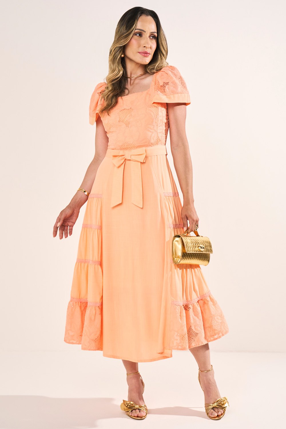 Os recortes com guipir e os bordados richelieu transformam o vestido em um modelo único e sofisticado. O cinto faixa acrescenta feminilidade e romantismo.