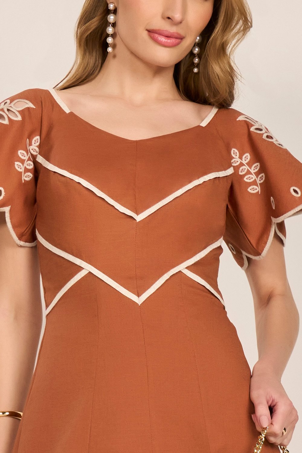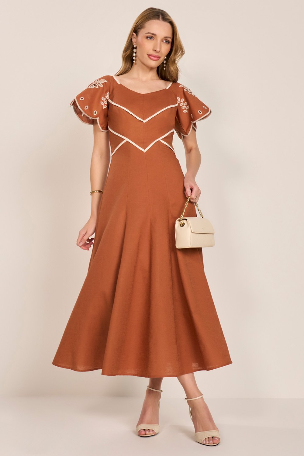 Elegante e cheio de personalidade, este vestido traz uma proposta charmosa com seu decote princesa e recortes que valorizam a silhueta. As mangas evasê ganham destaque com bordados richelieu em duo colors, criando um visual sofisticado e ao mesmo tempo leve. A saia em nesgas proporciona movimento e feminilidade, resultando em uma peça versátil para ocasiões especiais ou compromissos importantes.