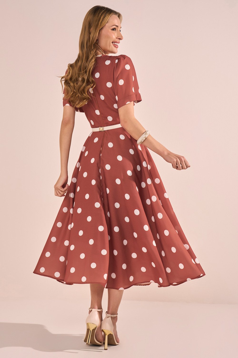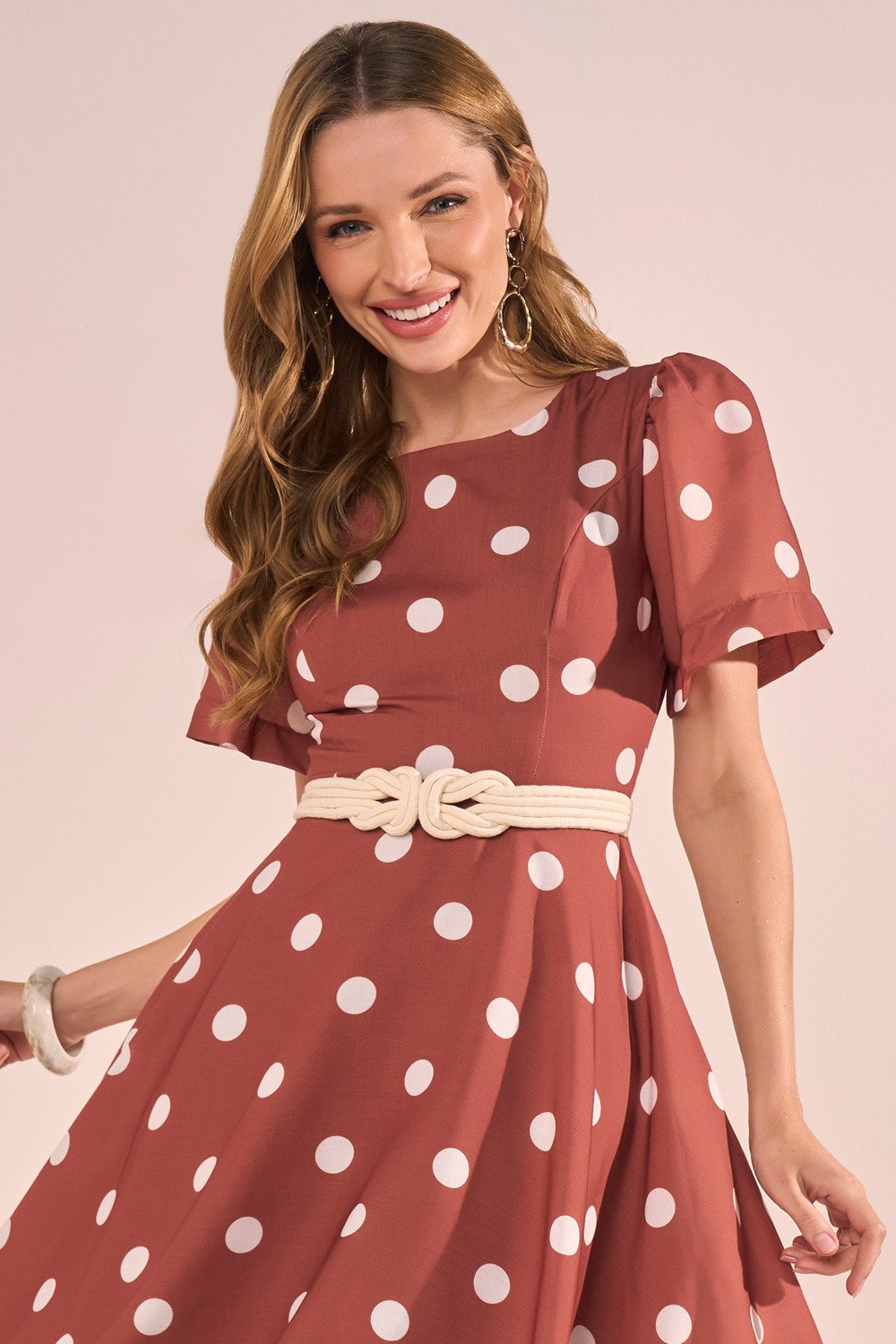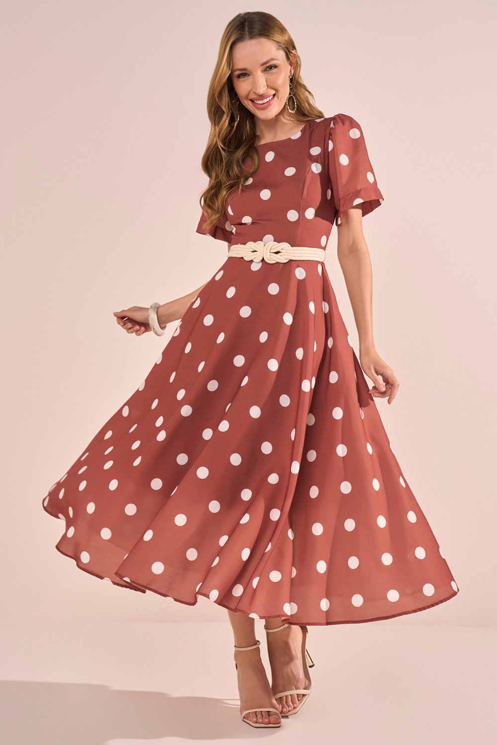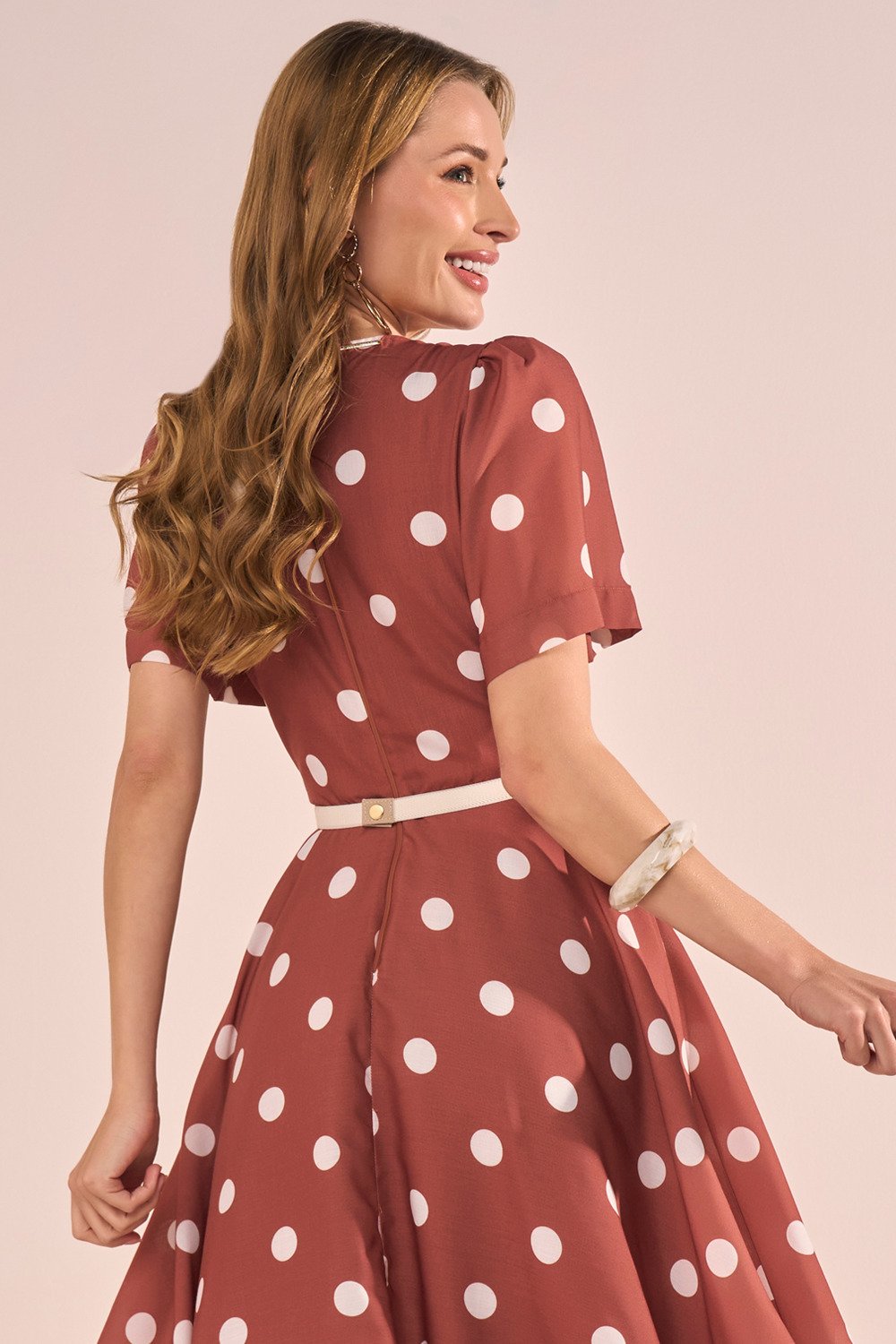 Este vestido é a escolha perfeita para quem busca um visual leve, feminino e cheio de movimento. Sua estampa clássica de poás traz um ar retrô e encantador, enquanto as mangas evasê adicionam fluidez e delicadeza ao look. O decote redondo valoriza a região do colo de forma discreta e elegante. A saia godê, complementada pelo forro em tule, garante um volume gracioso e um caimento impecável. Não acompanha cinto.