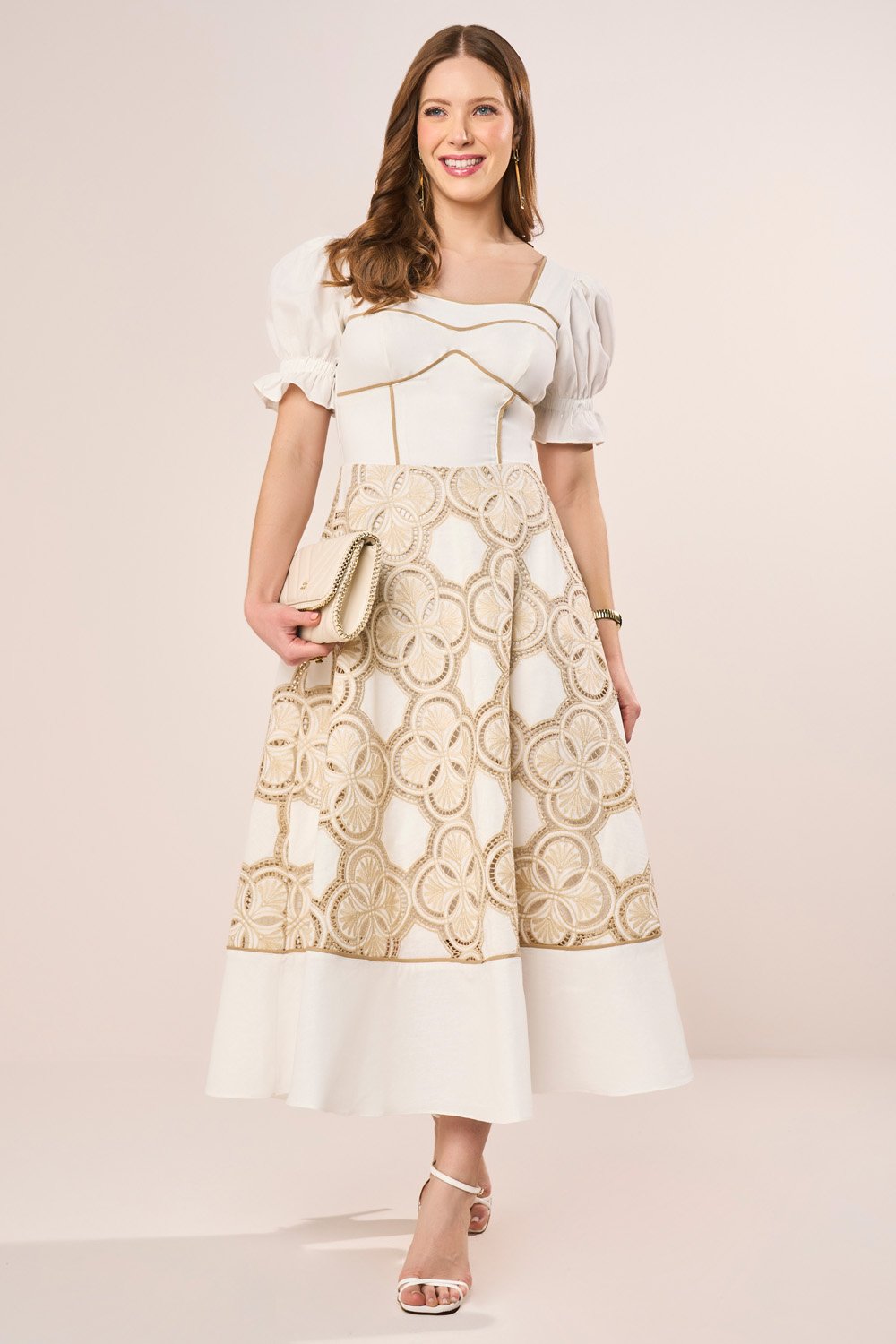 Os bordados Richelieu e o drapeado na saia conferem autenticidade e sofisticação à peça. É o equilíbrio perfeito entre delicadeza e estilo, ideal para ocasiões que pedem charme e feminilidade.