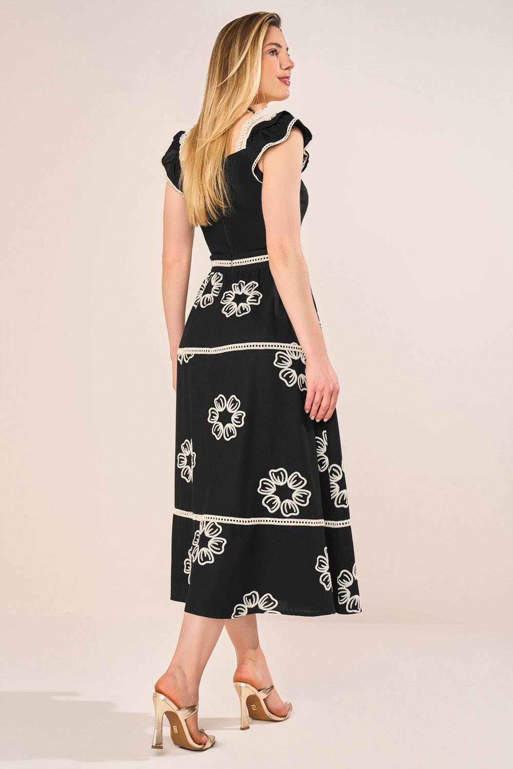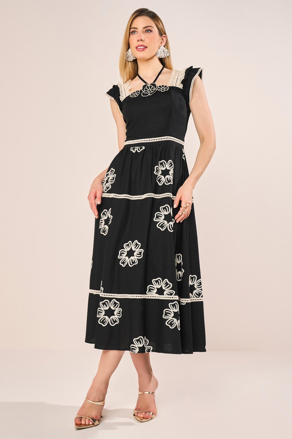 LANÇAMENTOFRETEGRÁTISENVIOIMEDIATOVestido Azul Com Flor 3D E Guipir Evasê Midi FasciniusR$ 743,91 no PIX
