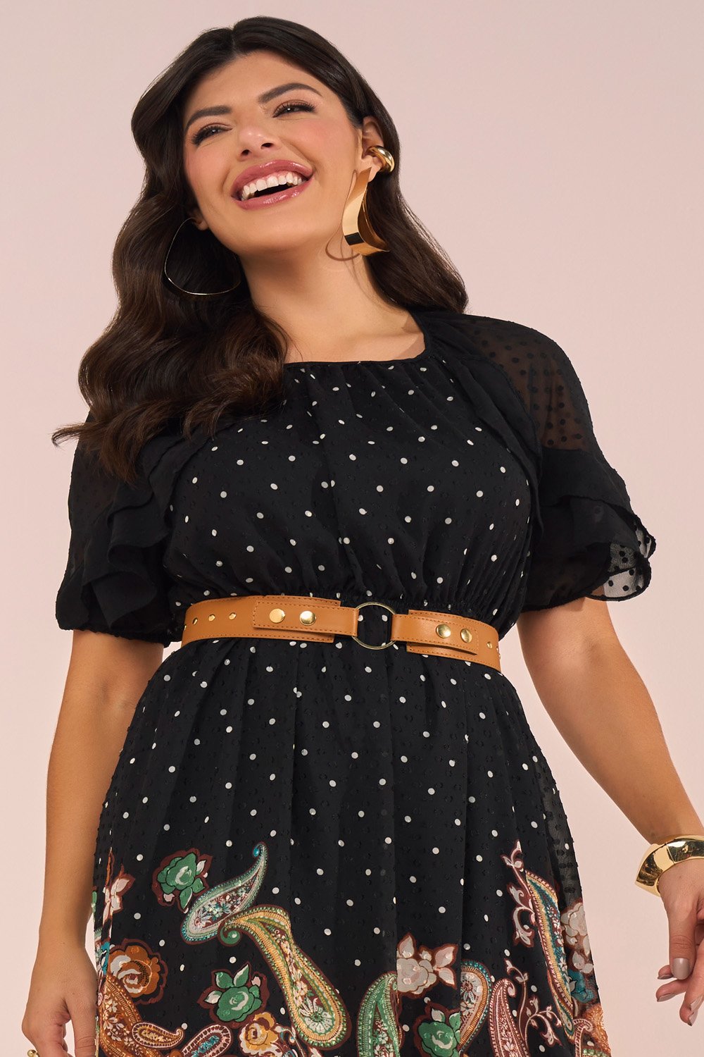 O crepe texturizado com poás é leve, fresco e confortável, ideal para acompanhar a rotina com estilo. O caimento fluido proporciona sofisticação e naturalidade ao visual, enquanto o mix de estampa dá um ar moderno e exclusivo à peça. O vestido possui forro interno, garantindo segurança e valorizando o caimento sem transparências.