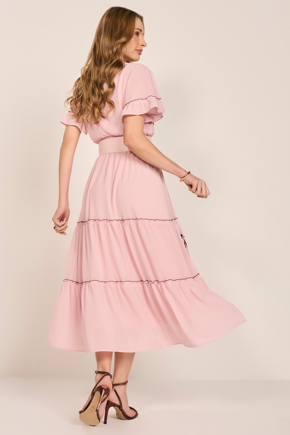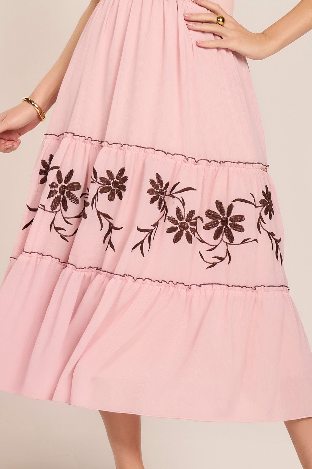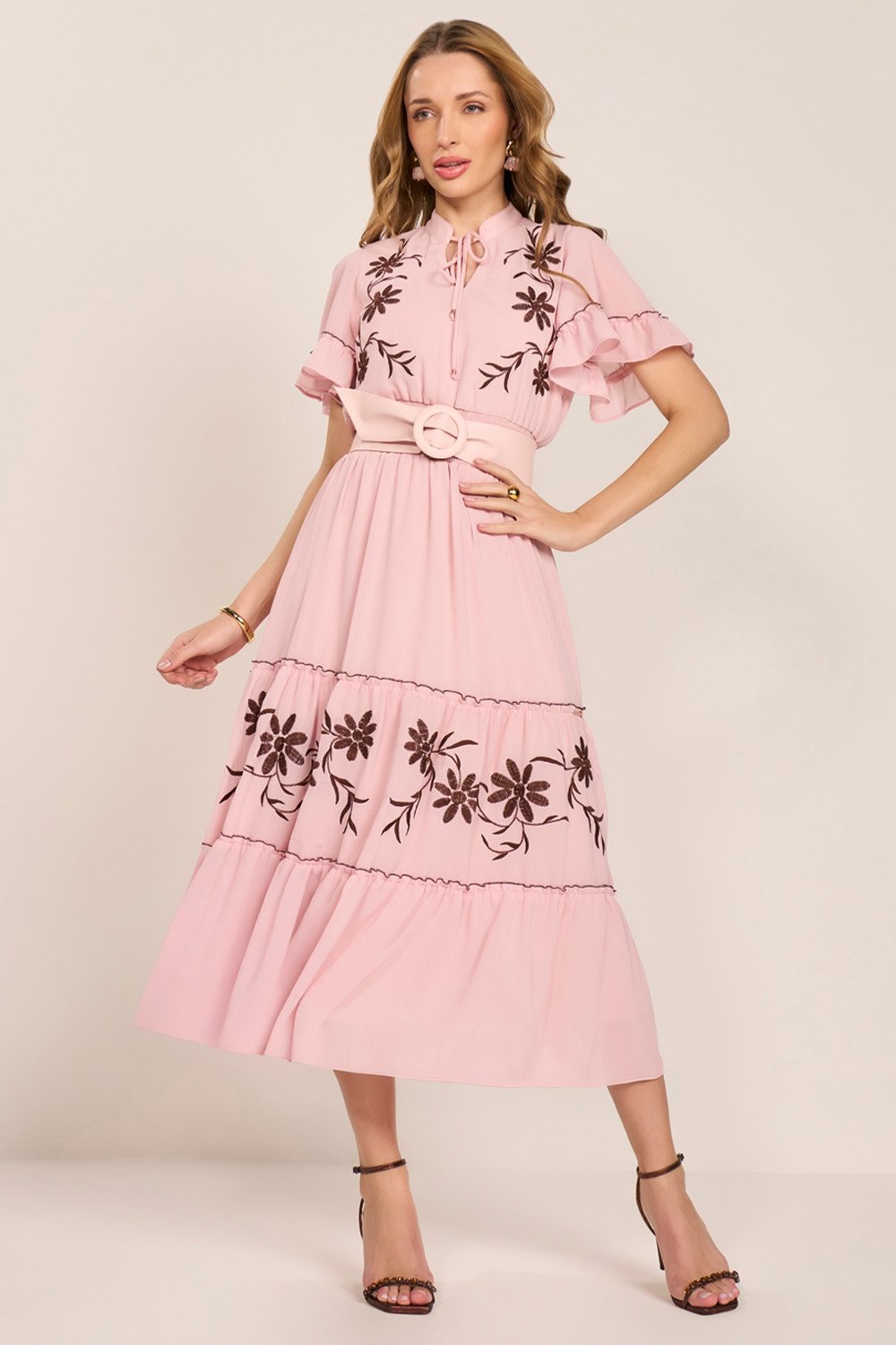 O vestido se destaca pelos bordados industriais aplicados de forma estratégica, criando uma composição visual delicada e elegante. O decote em V com amarração e ponteiras de metal confere charme e modernidade. As mangas evasê e a saia em marias equilibram volume e fluidez, resultando em uma peça feminina e sofisticada. Não acompanha cinto.