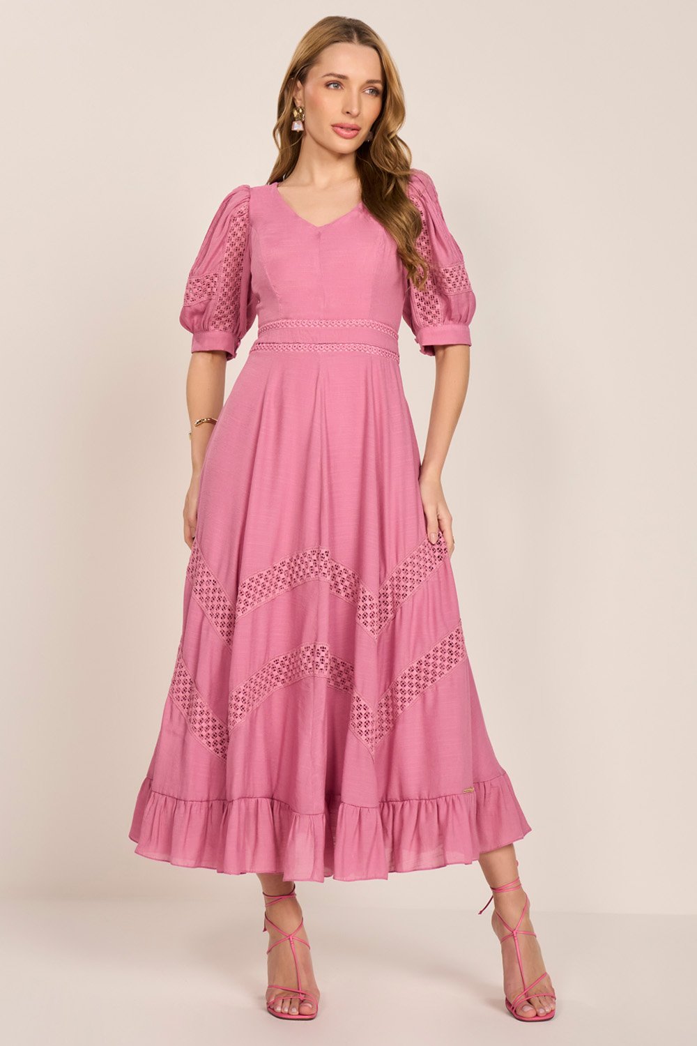 A integração dos entremeios de guipir na estrutura da peça valoriza a cintura e dá destaque ao acabamento. O zíper nas costas mantém a praticidade sem interferir no design delicado. Um vestido encantador, feito para quem aprecia peças com trabalho minucioso e caimento perfeito.