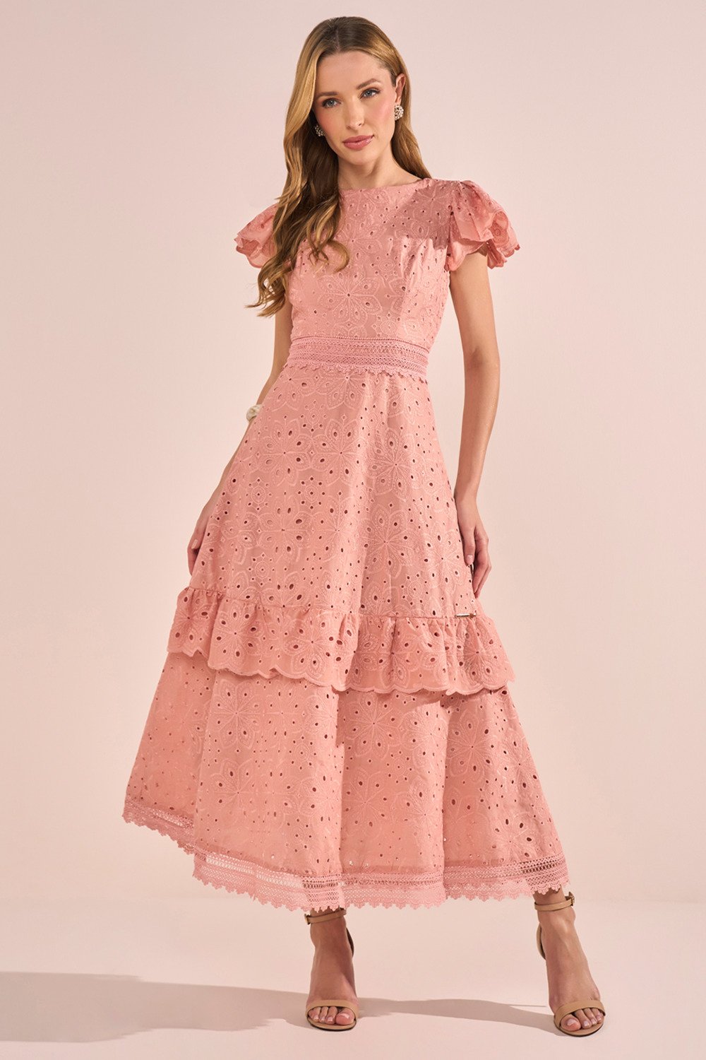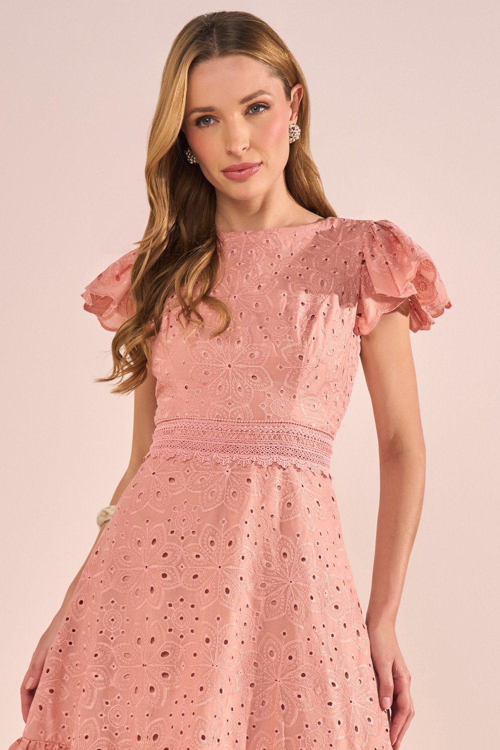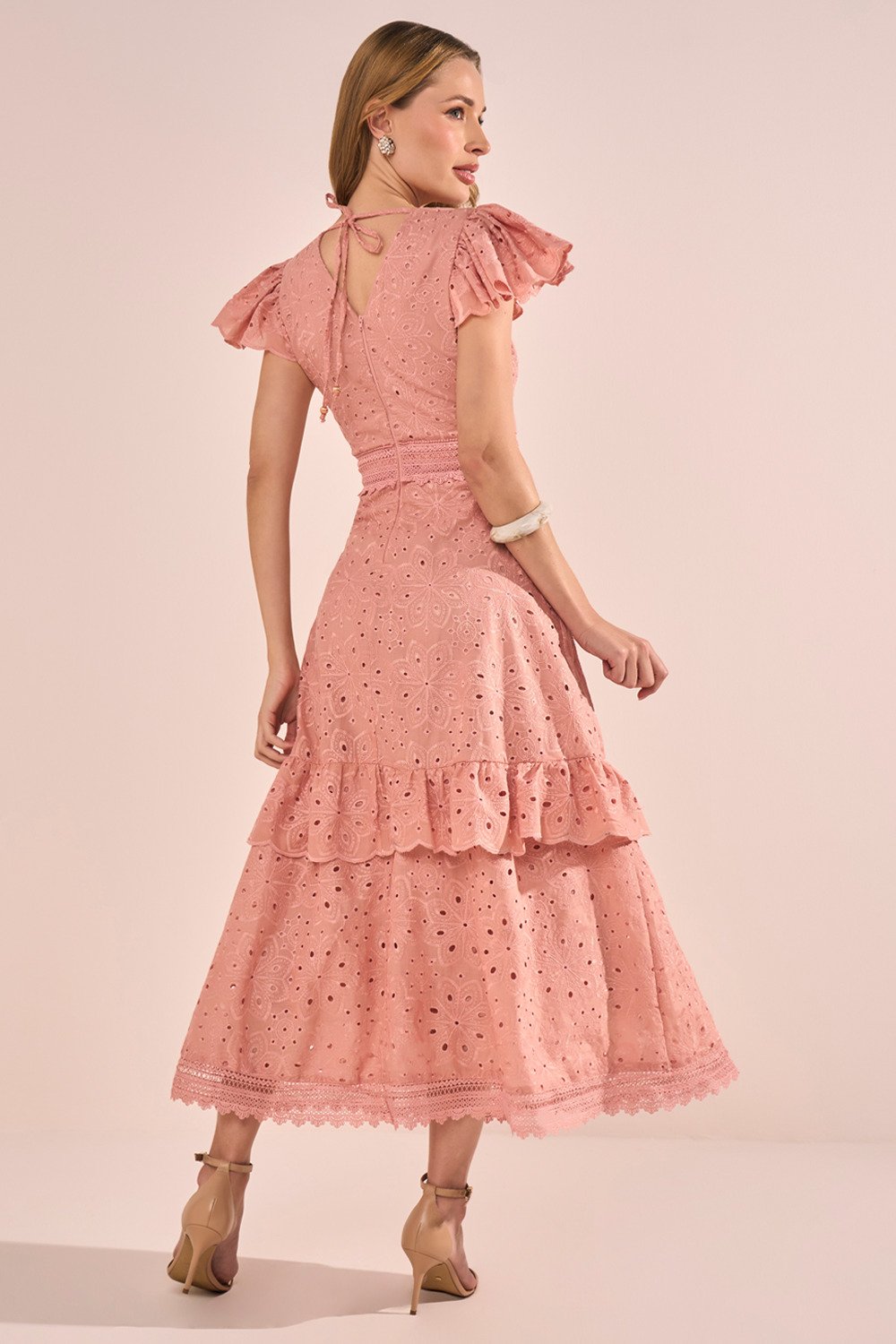 Confeccionado em laise de algodão, este vestido oferece frescor e maciez ao toque, sendo perfeito para dias mais quentes. O tecido possui perfurações sutis que, além de conferirem leveza, enriquecem o visual com um charme artesanal. O algodão garante respirabilidade e conforto durante todo o uso.