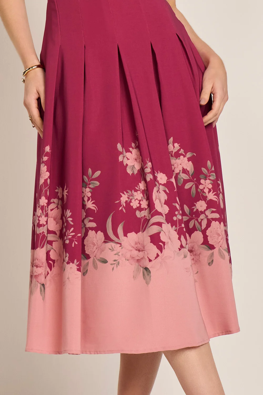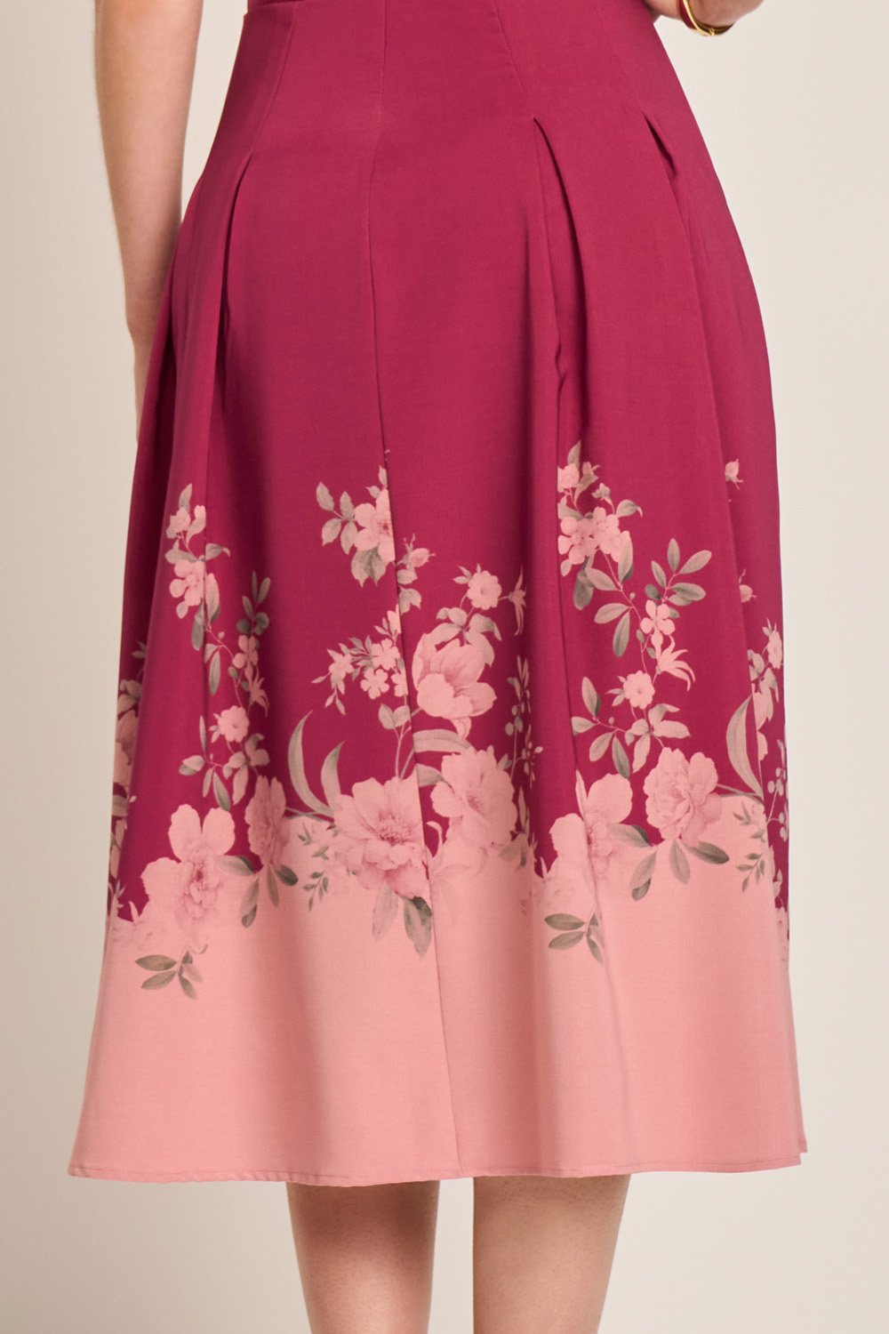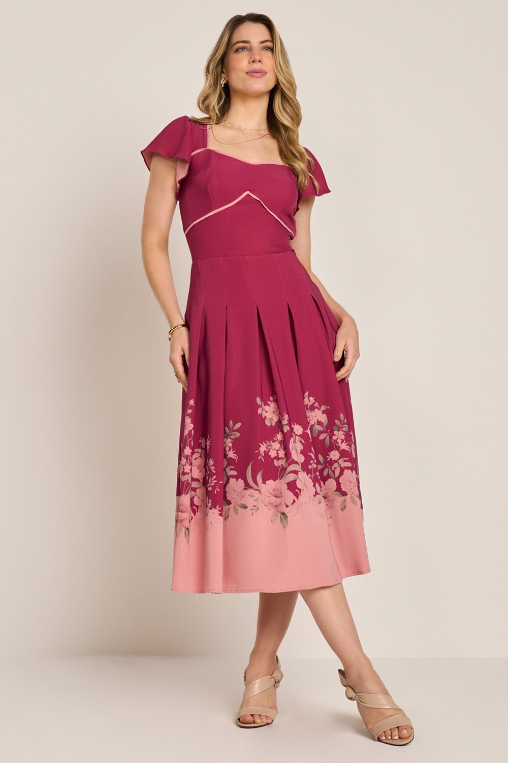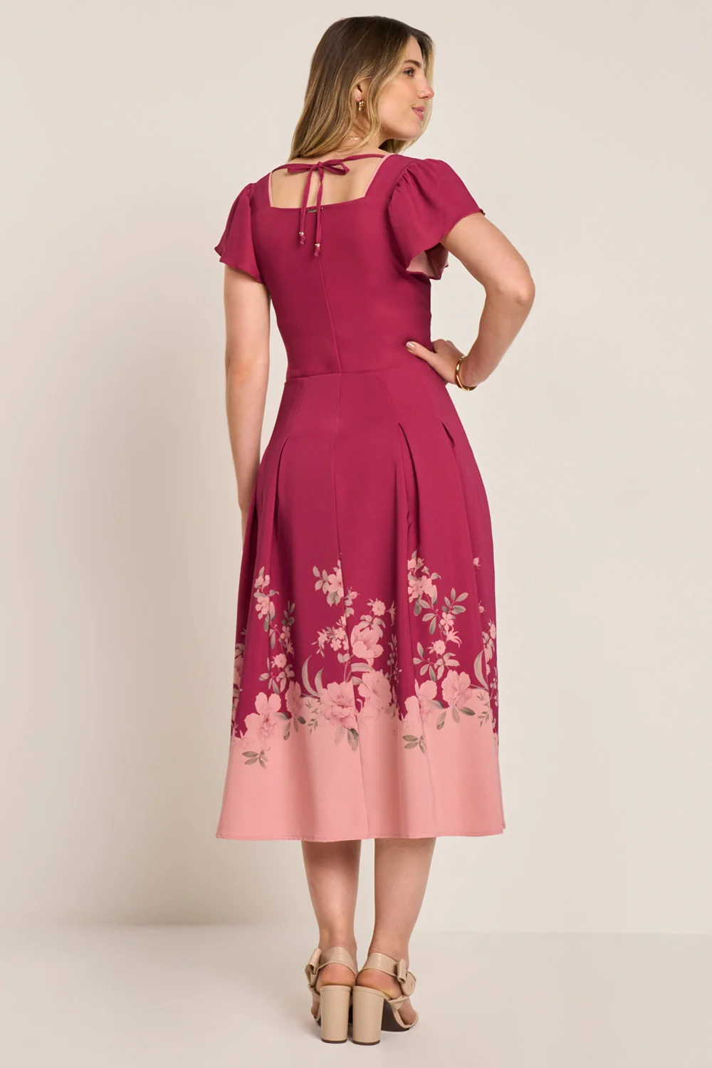 A estampa no barrado valoriza o movimento e a feminilidade, enquanto o decote princesa realça o colo com delicadeza. A amarração traseira permite ajuste perfeito ao corpo. Um vestido poético e encantador para ocasiões que pedem suavidade e beleza.