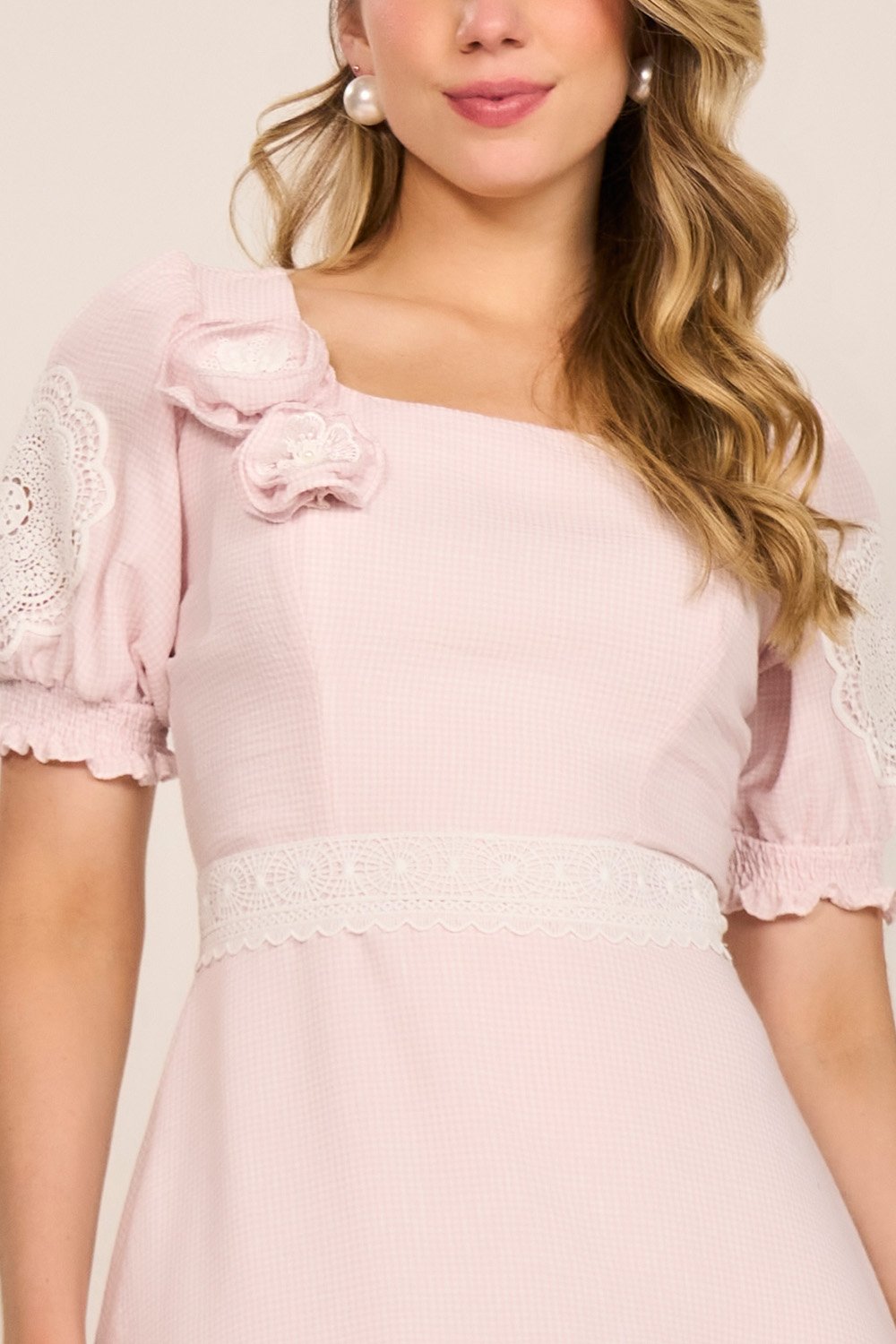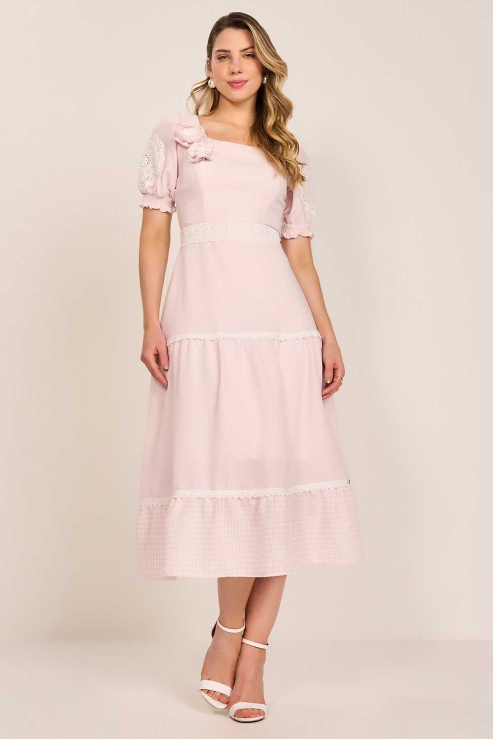 Com um visual romântico e elegante, o vestido apresenta um encantador mix de estampa vicky, enriquecido por detalhes em guipir nas mangas que valorizam a delicadeza da peça. Acompanha broche em flor com acabamento refinado, adicionando sofisticação ao visual. Sua modelagem evasê e comprimento midi garantem leveza e movimento, perfeito para compor produções clássicas com um toque fashion.