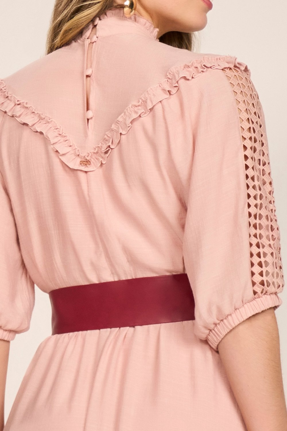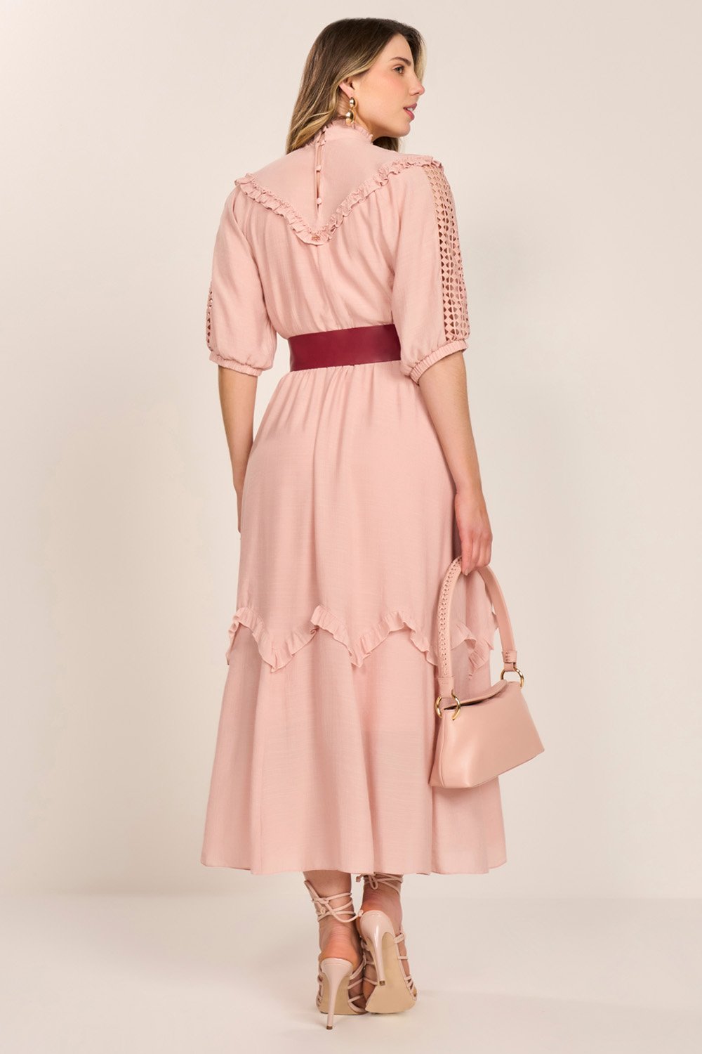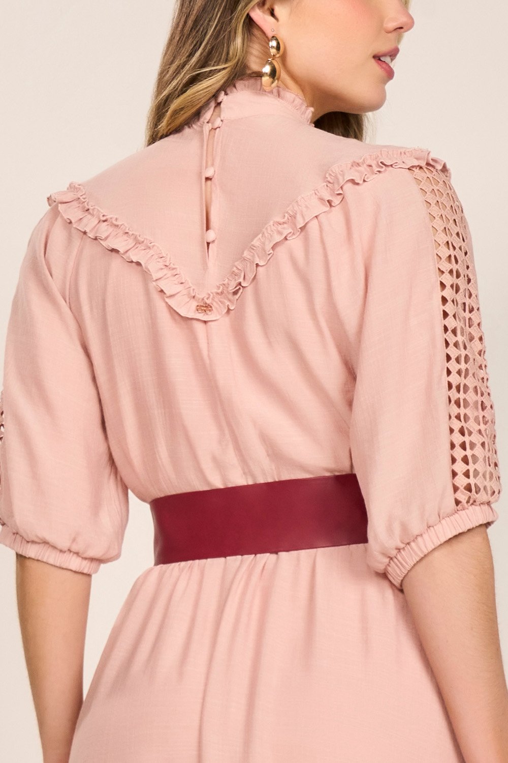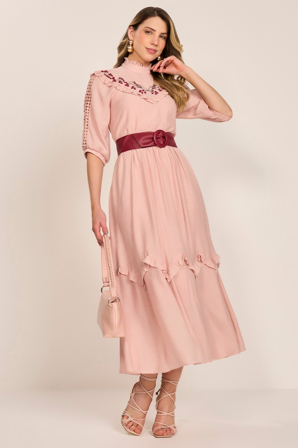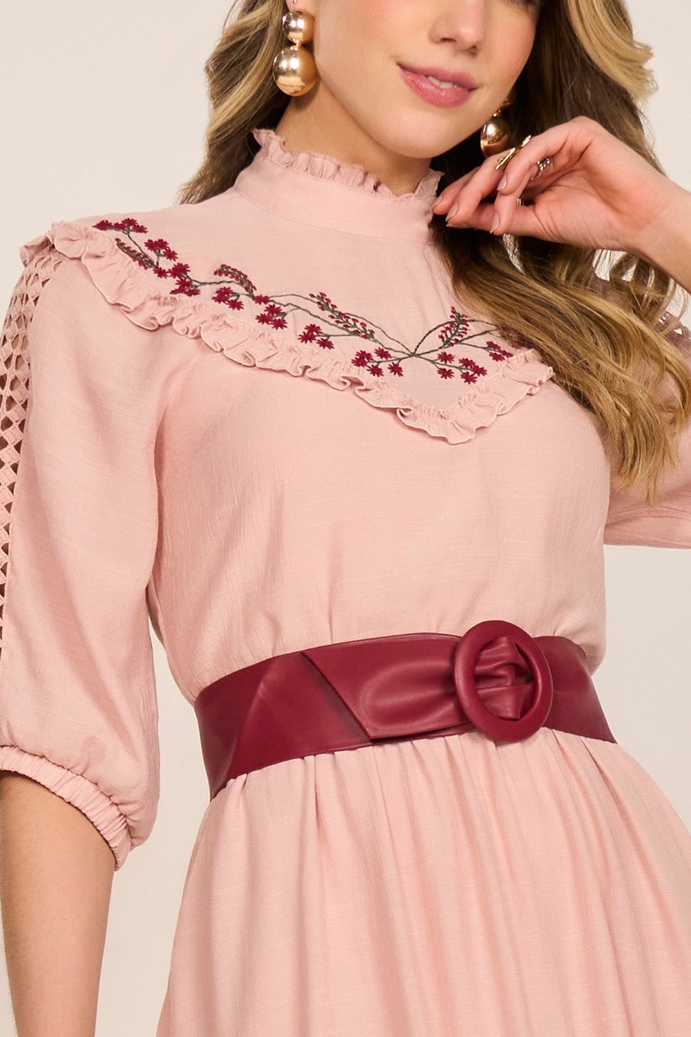 Este vestido reúne detalhes artesanais com design moderno e elegante. Possui gola alta com babados, mangas raglan com entremeios de guipir vazados e mini bordados florais que percorrem a peça com delicadeza. A cintura com elástico proporciona ajuste confortável, e a saia em nesgas com babados completa a silhueta com equilíbrio e leveza. Acompanha cinto faixa em couro ecológico que reforça a elegância do look..