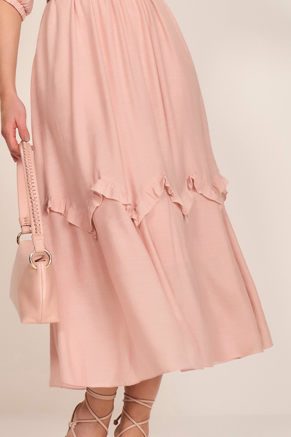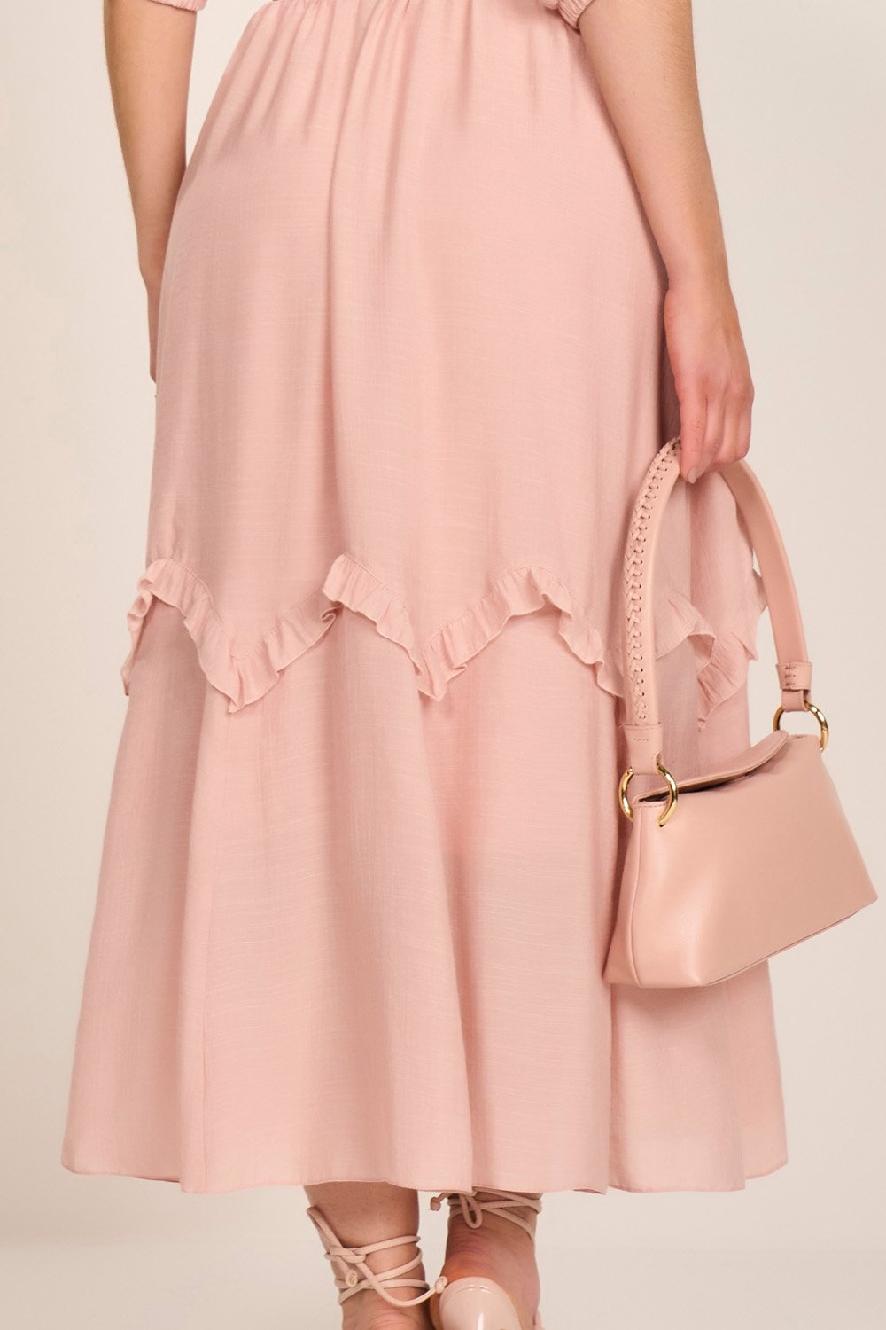 Produzido em viscose leve, o tecido garante frescor, movimento e toque suave ao corpo. O forro foi incorporado para reforçar o caimento da saia e preservar o visual alinhado mesmo com os entremeios vazados, mantendo a estrutura e a discrição do vestido nas regiões-chave.