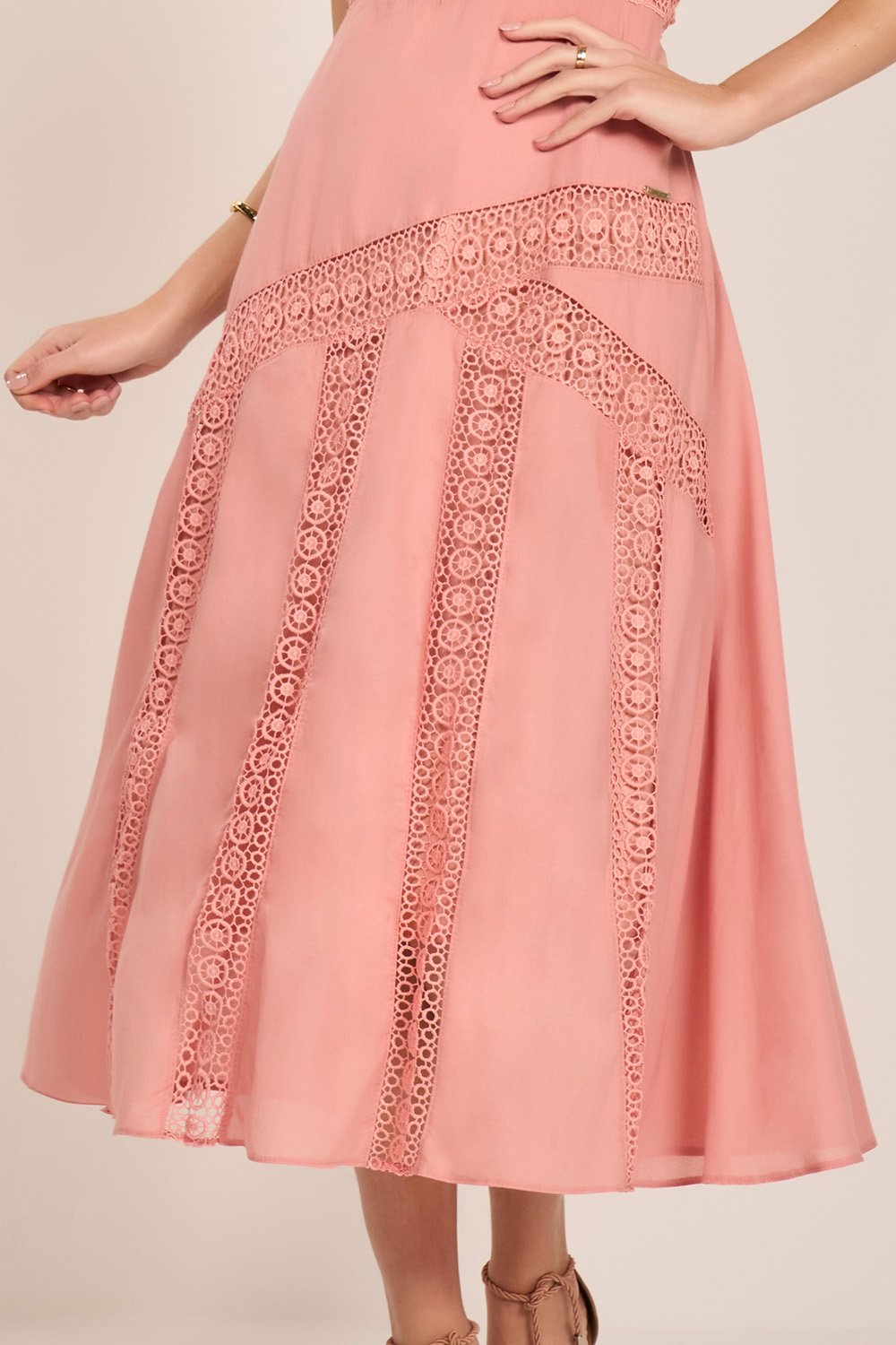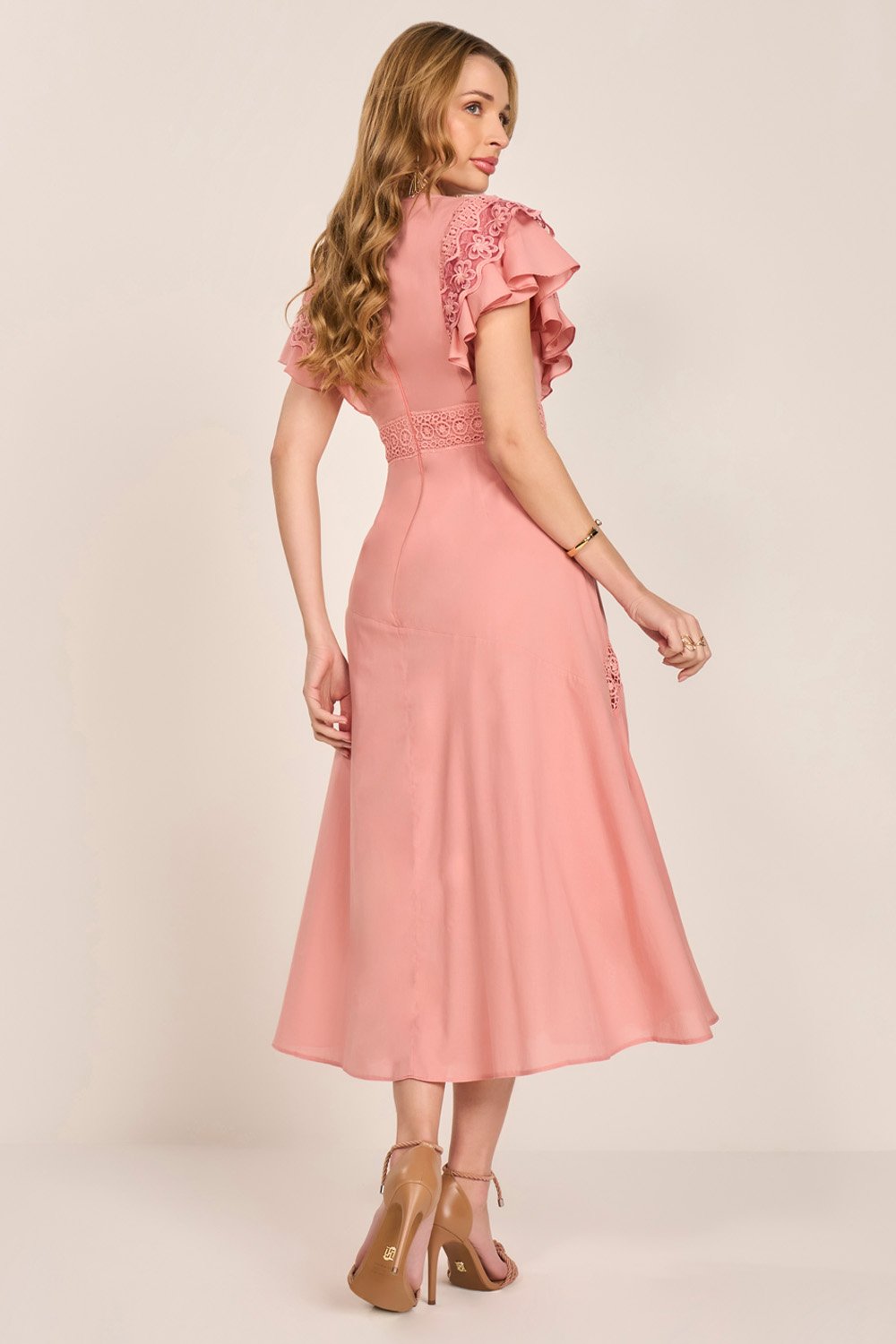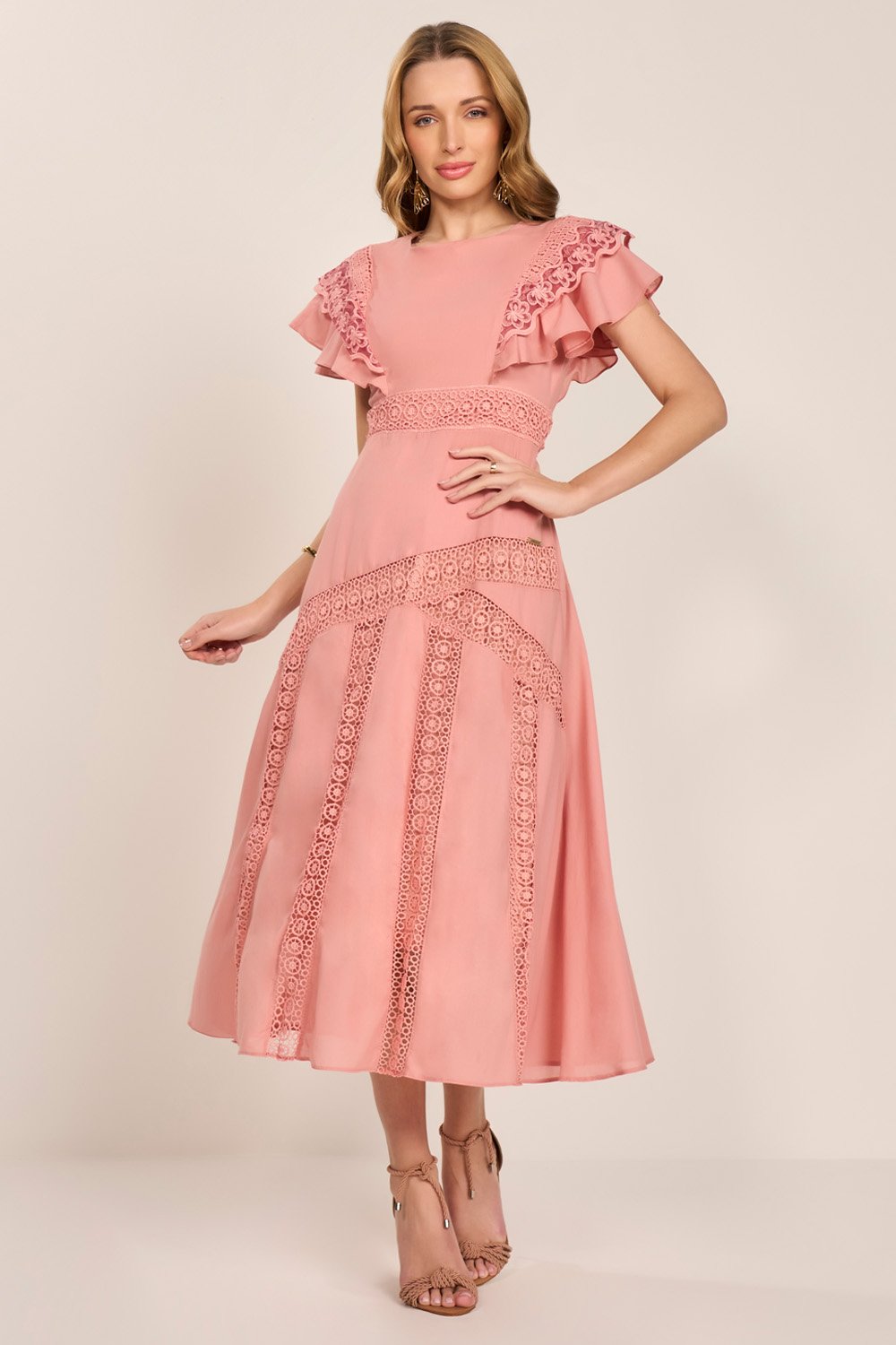Elegante e delicado, este vestido encanta com seus detalhes artesanais e visual refinado. A aplicação de tule bordado e entremeios de guipir em formas geométricas adiciona sofisticação à peça. As mangas com babado e a modelagem evasê garantem leveza, enquanto o comprimento midi mantém a elegância em destaque.