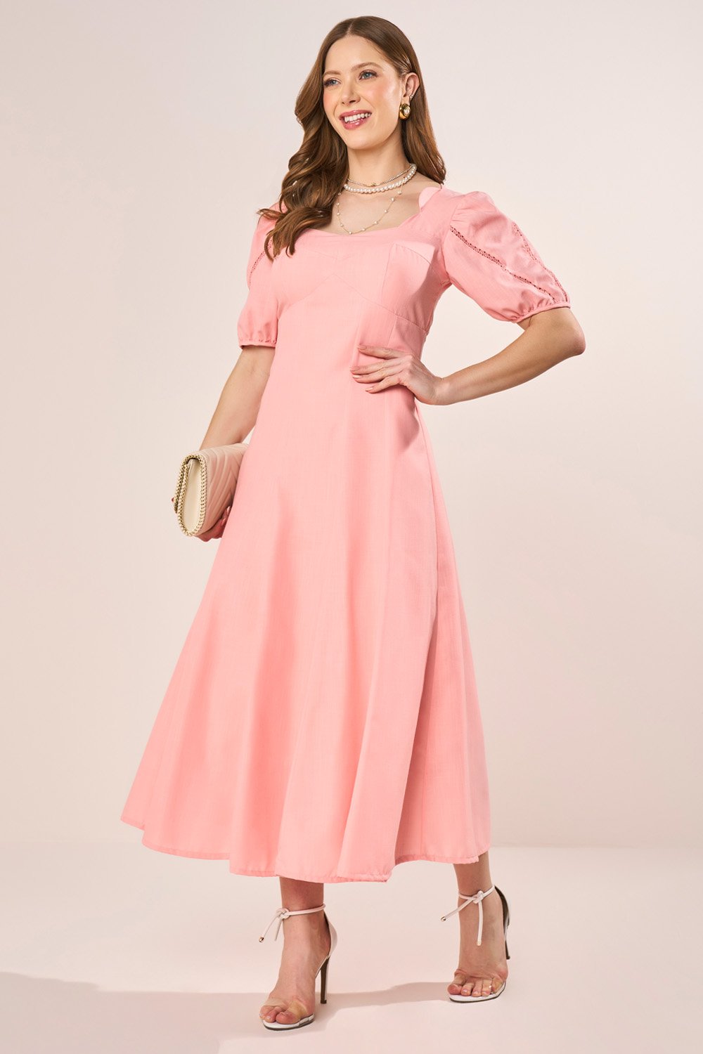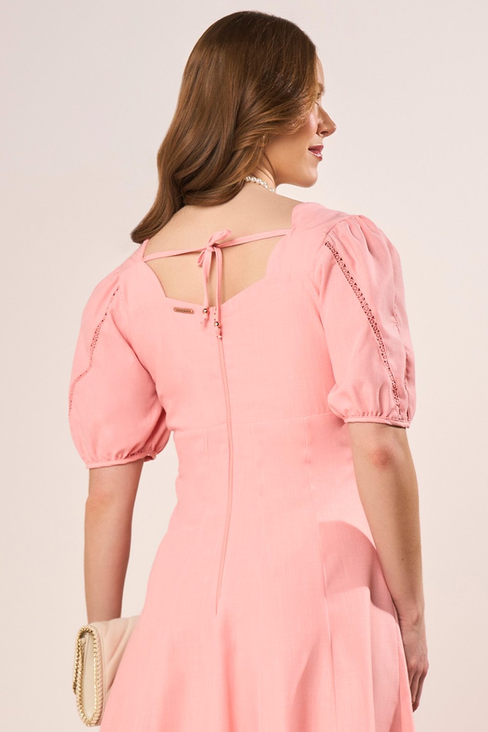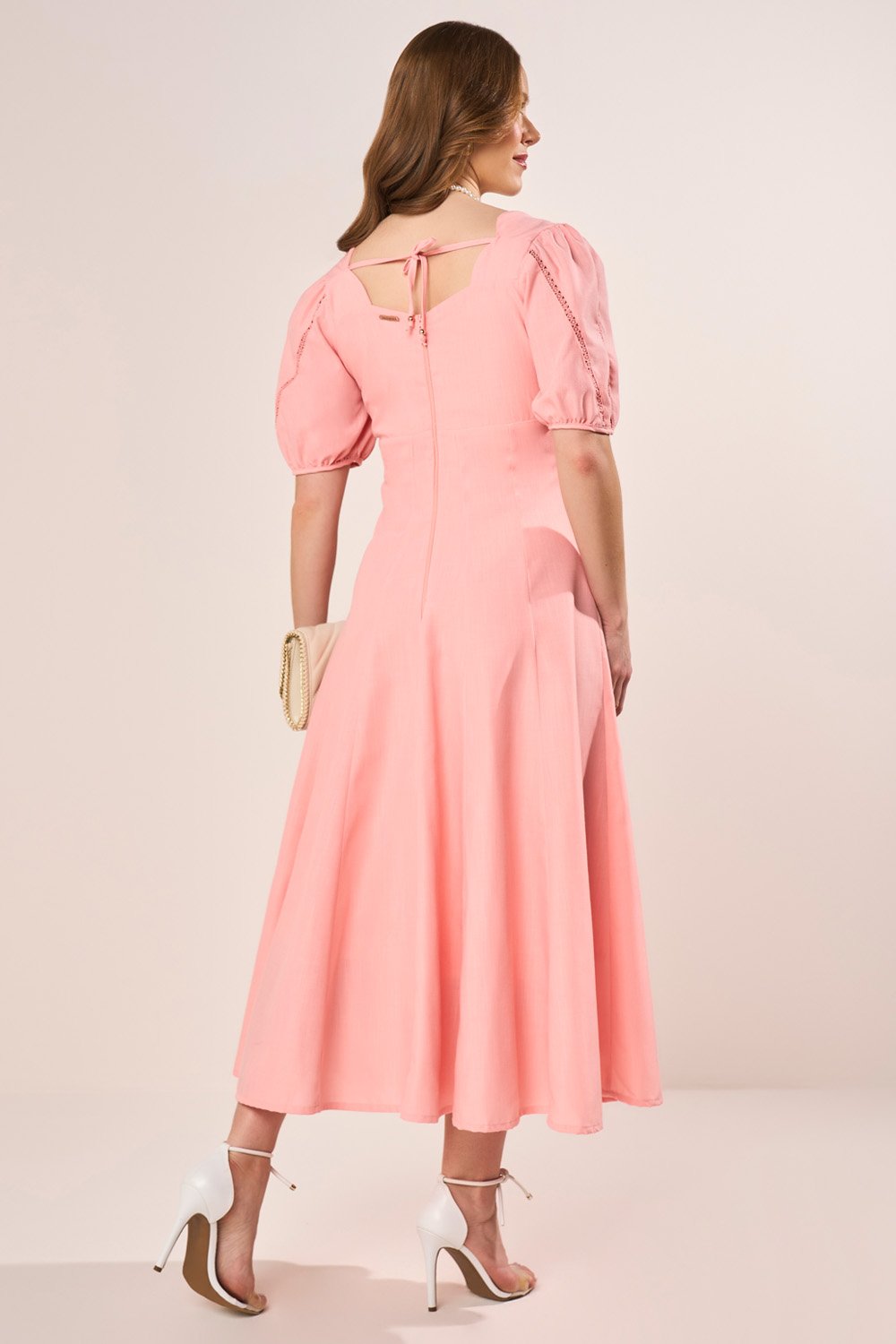 Este vestido midi traduz o equilíbrio perfeito entre romantismo e elegância. O decote princesa, aliado às mangas com entremeios de guipir, valoriza o colo com delicadeza, enquanto os recortes arredondados do cós realçam a feminilidade da silhueta. A saia em nesgas proporciona movimento fluido e refinado, tornando a peça ideal para eventos especiais ou produções diurnas elegantes.