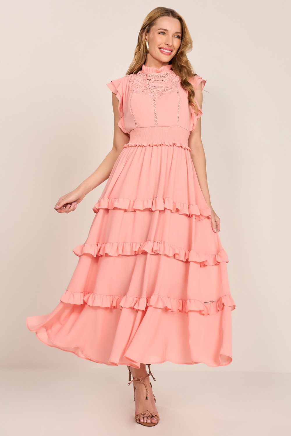 O guipir aparece de forma elegante nos recortes, elevando a sofisticação da peça. Os babados nas mangas e na saia completam a proposta com movimento e charme. Um vestido ideal para ocasiões onde elegância e suavidade precisam caminhar juntas.