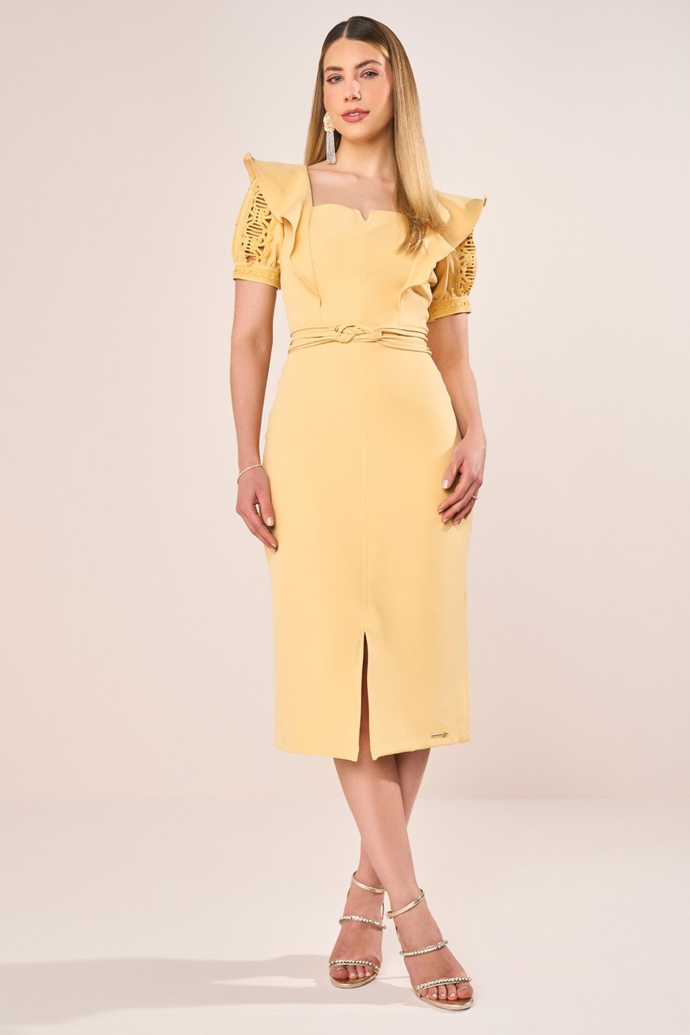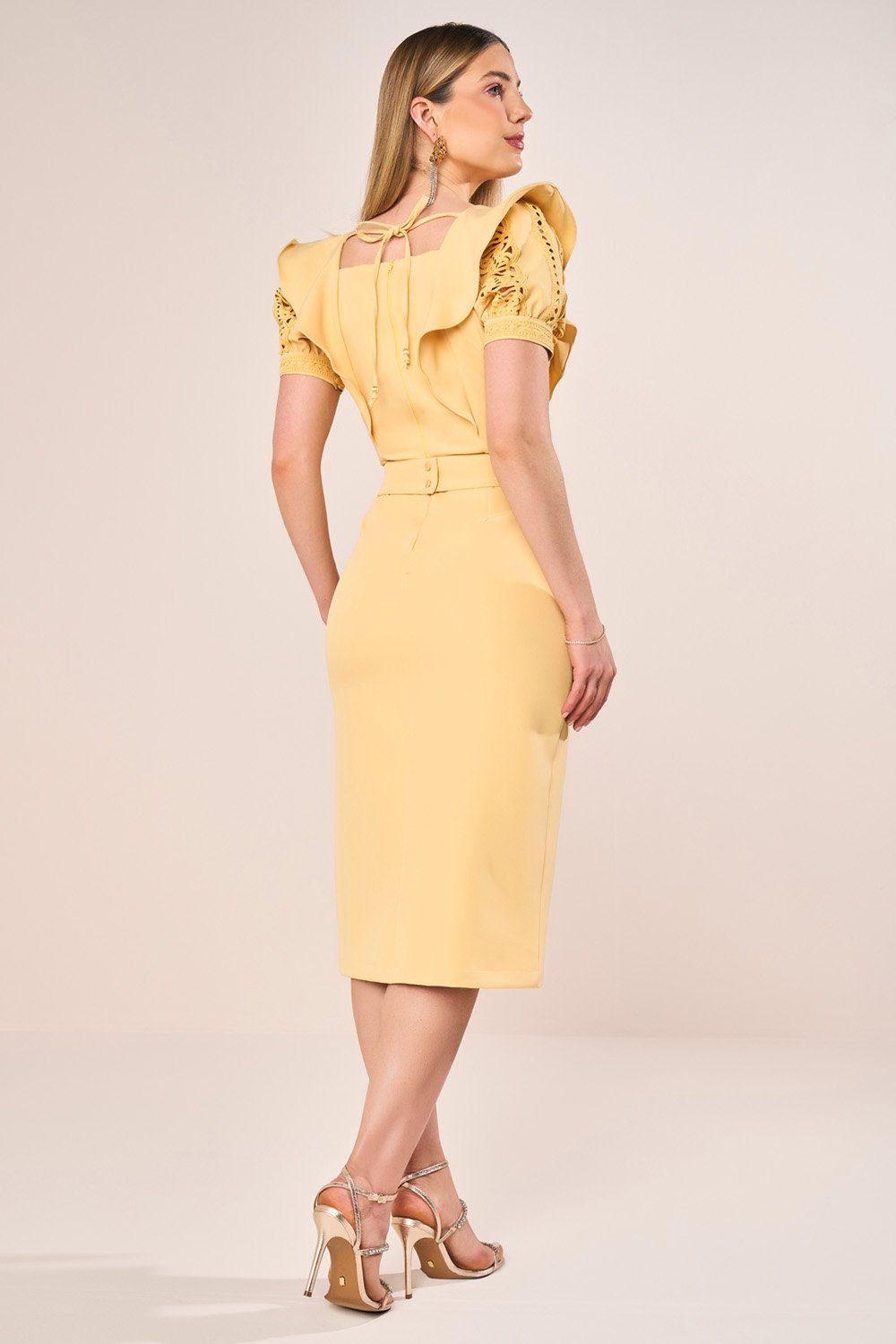 O detalhe do decote com abertura em V se destaca como ponto focal sofisticado, elevando a estética do tubinho de forma contemporânea. As aplicações de guipir nas mangas e punhos criam contraste elegante com a alfaiataria, enriquecendo a peça com toque artesanal. O cinto faixa entrelaçado, finalizado com abotoamento, acrescenta personalidade e compõe a cintura com charme exclusivo. A fenda frontal, aliada ao recorte e ao pesponto, reforça a modernidade da peça sem abrir mão da elegância clássica.