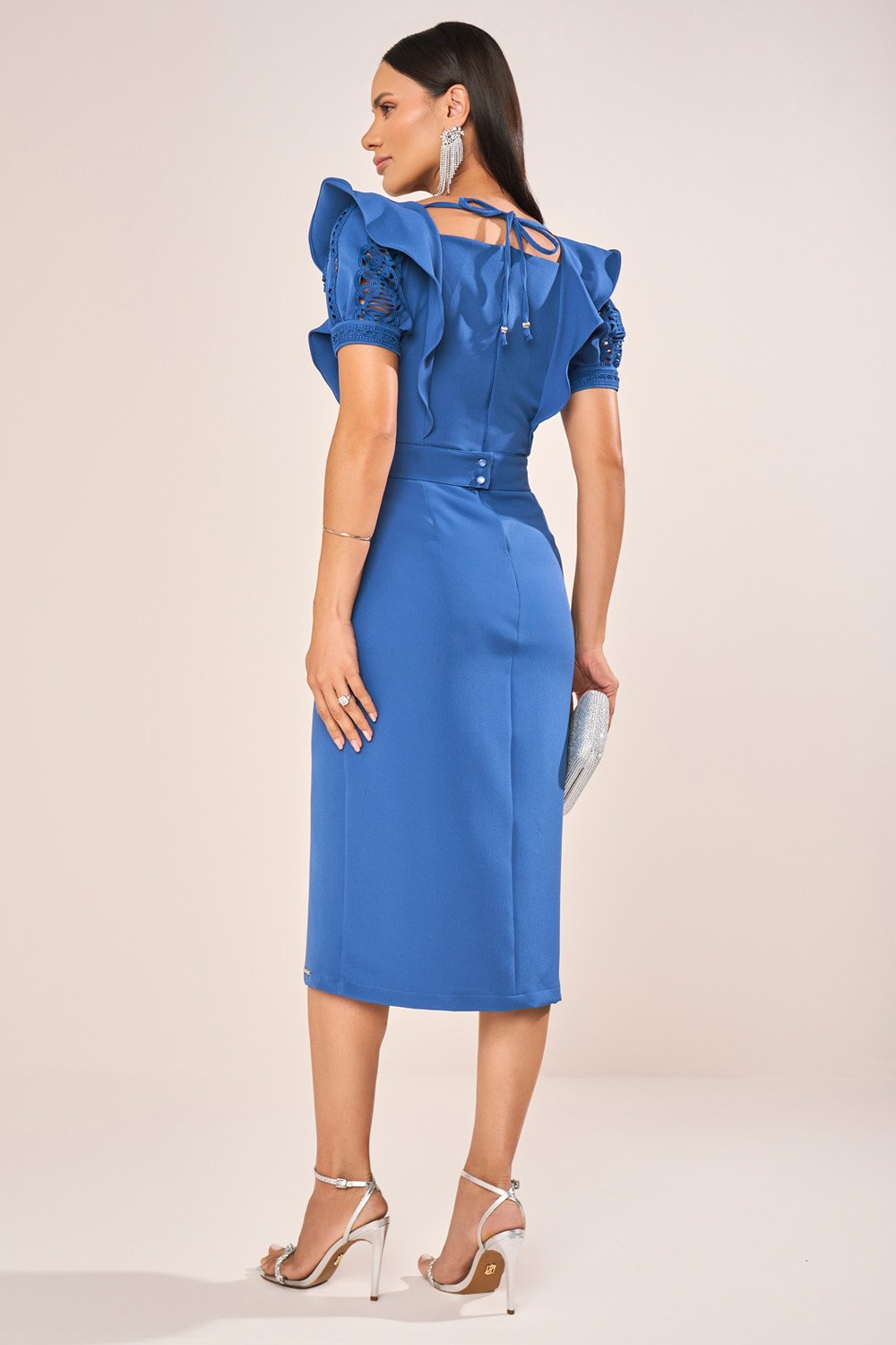 O detalhe do decote com abertura em V se destaca como ponto focal sofisticado, elevando a estética do tubinho de forma contemporânea. As aplicações de guipir nas mangas e punhos criam contraste elegante com a alfaiataria, enriquecendo a peça com toque artesanal. O cinto faixa entrelaçado, finalizado com abotoamento, acrescenta personalidade e compõe a cintura com charme exclusivo. A fenda frontal, aliada ao recorte e ao pesponto, reforça a modernidade da peça sem abrir mão da elegância clássica.