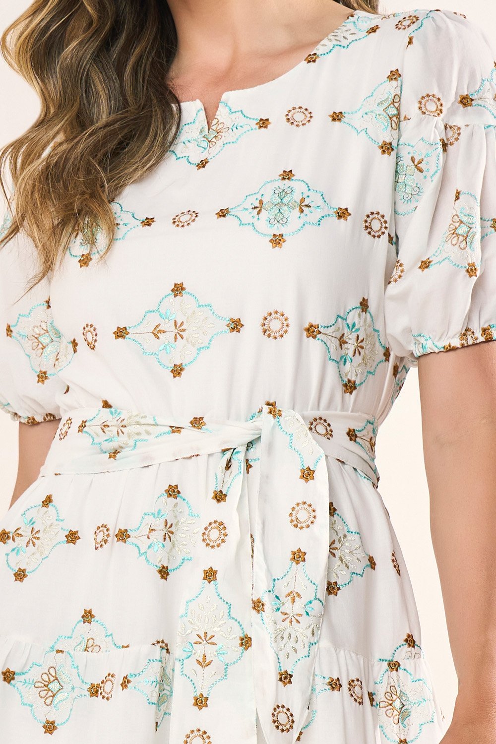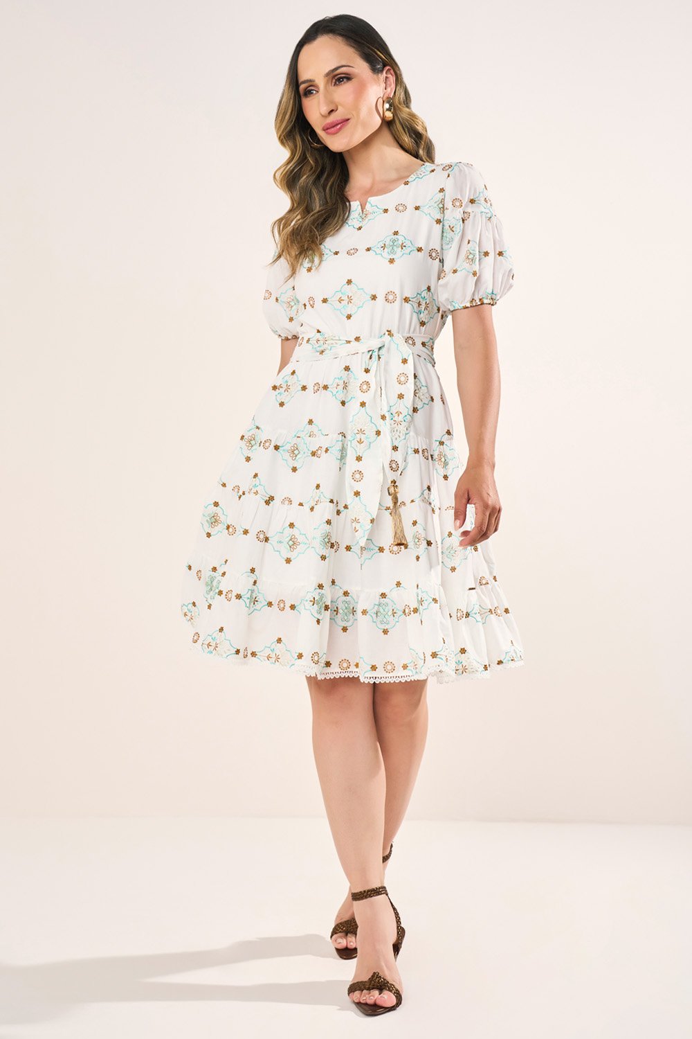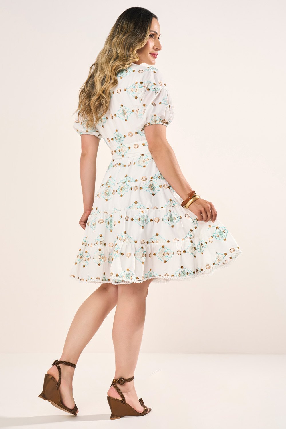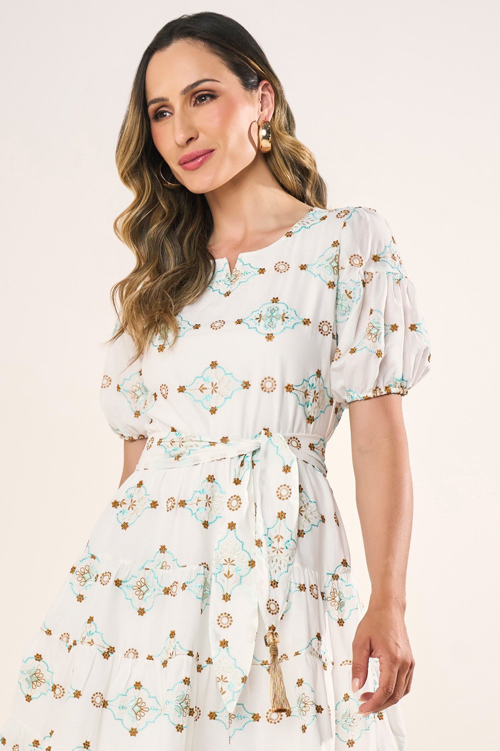 Este vestido em algodão combina sofisticação e estilo artesanal. Os bordados industriais com fios de lurex adicionam brilho discreto e diferenciado. As mangas com recortes e punhos em elástico garantem conforto e charme. A saia em marias reforça o romantismo, enquanto o cós com elástico assegura praticidade.