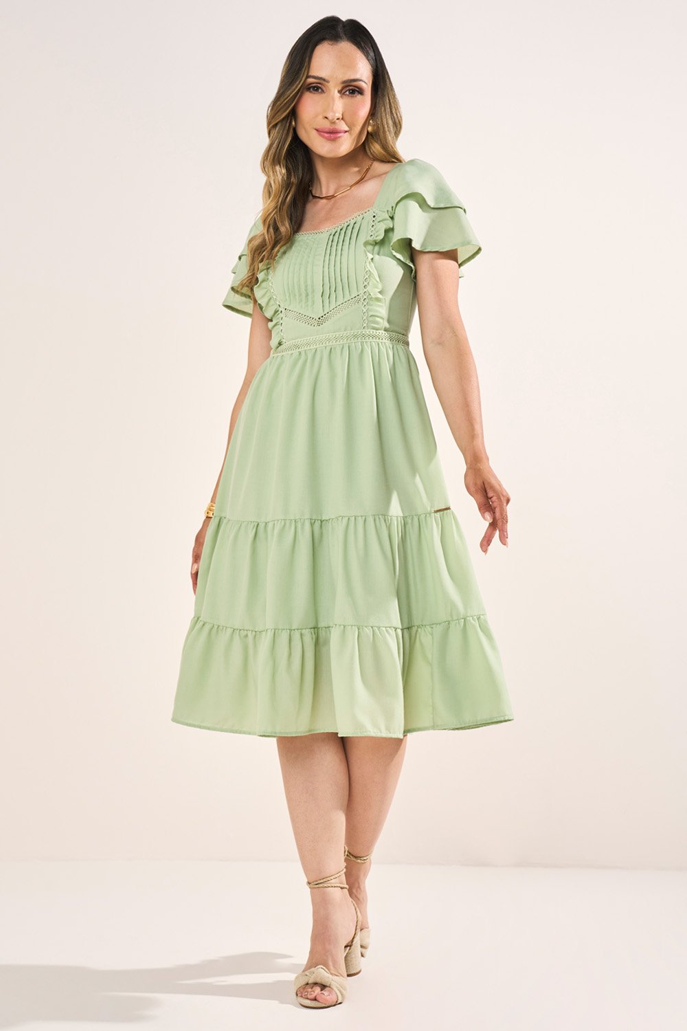 Com estilo romântico e jovial, este vestido é confeccionado em tricoline e se destaca pela leveza. As mangas em camadas de babados trazem movimento e delicadeza, enquanto a amarração nas costas garante ajuste e modernidade. A peça é enriquecida por detalhes de pregas e babadinhos, tornando-a única e especial.
