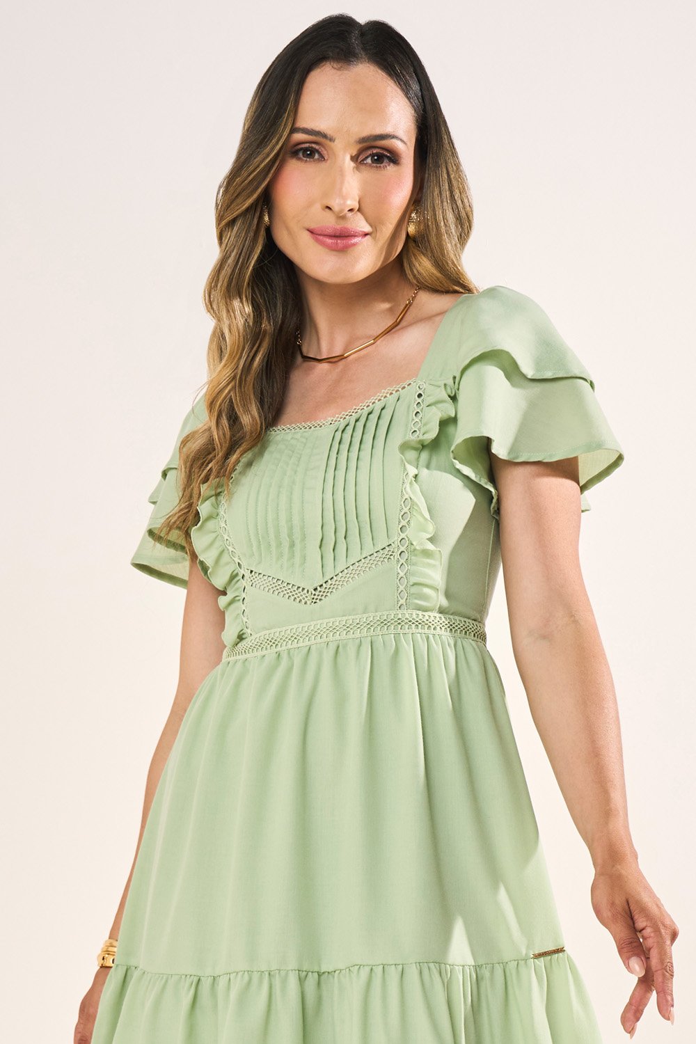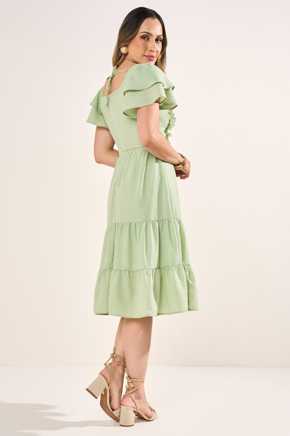 A saia em marias adiciona movimento encantador, reforçando o romantismo da peça. A amarração nas costas cria um detalhe moderno, enquanto as pregas e babadinhos enriquecem o design. Um vestido curto versátil, pensado para quem deseja leveza, delicadeza e feminilidade em um único modelo.