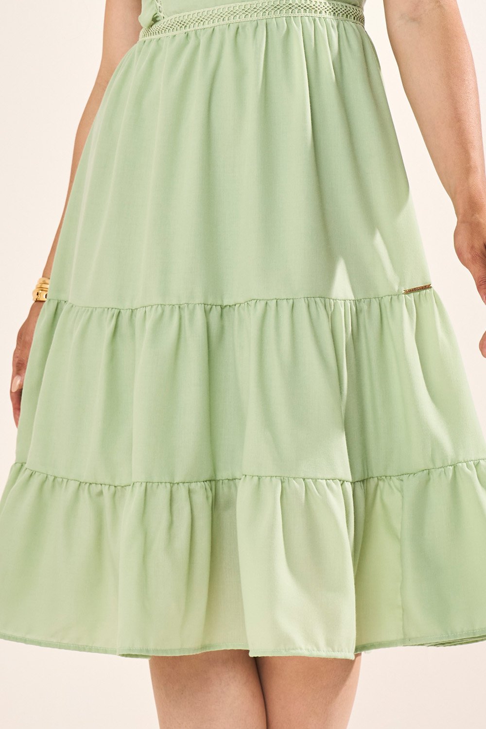 O tricoline é conhecido por sua leveza e estrutura delicada, oferecendo caimento agradável e praticidade no dia a dia. Além disso, garante frescor e conforto, tornando a peça perfeita para diversas ocasiões. O forro interno reforça a segurança, valorizando a modelagem curta e evasê.