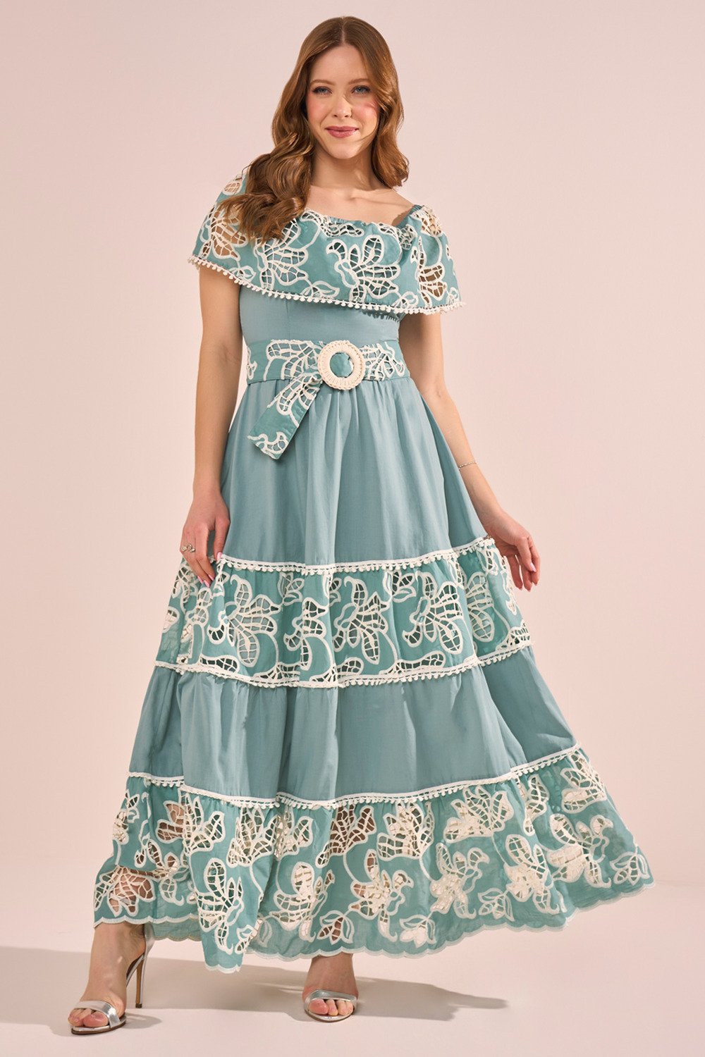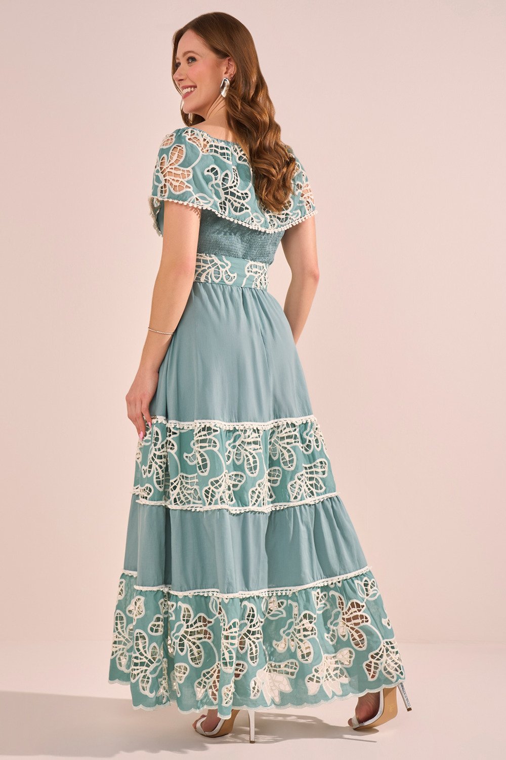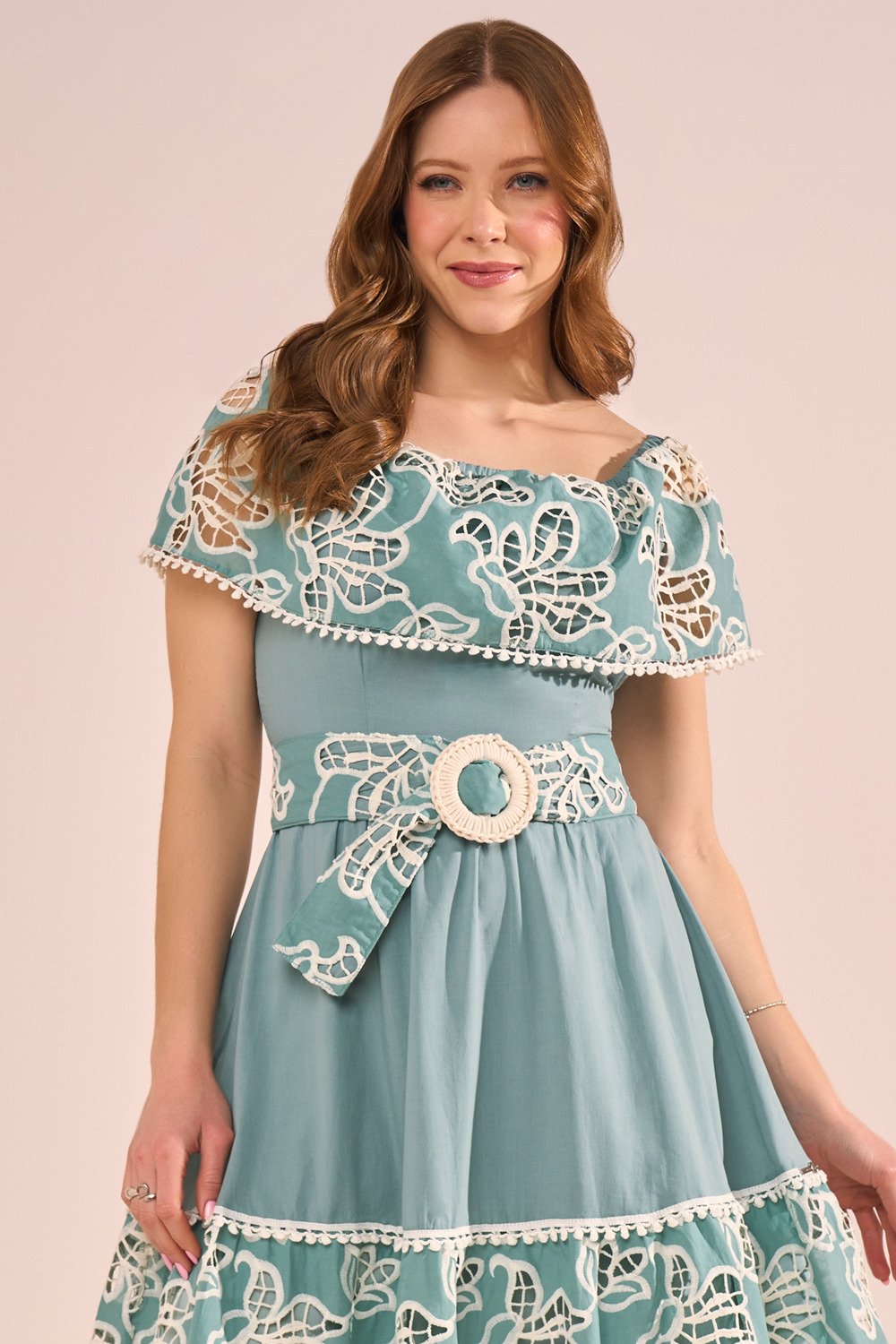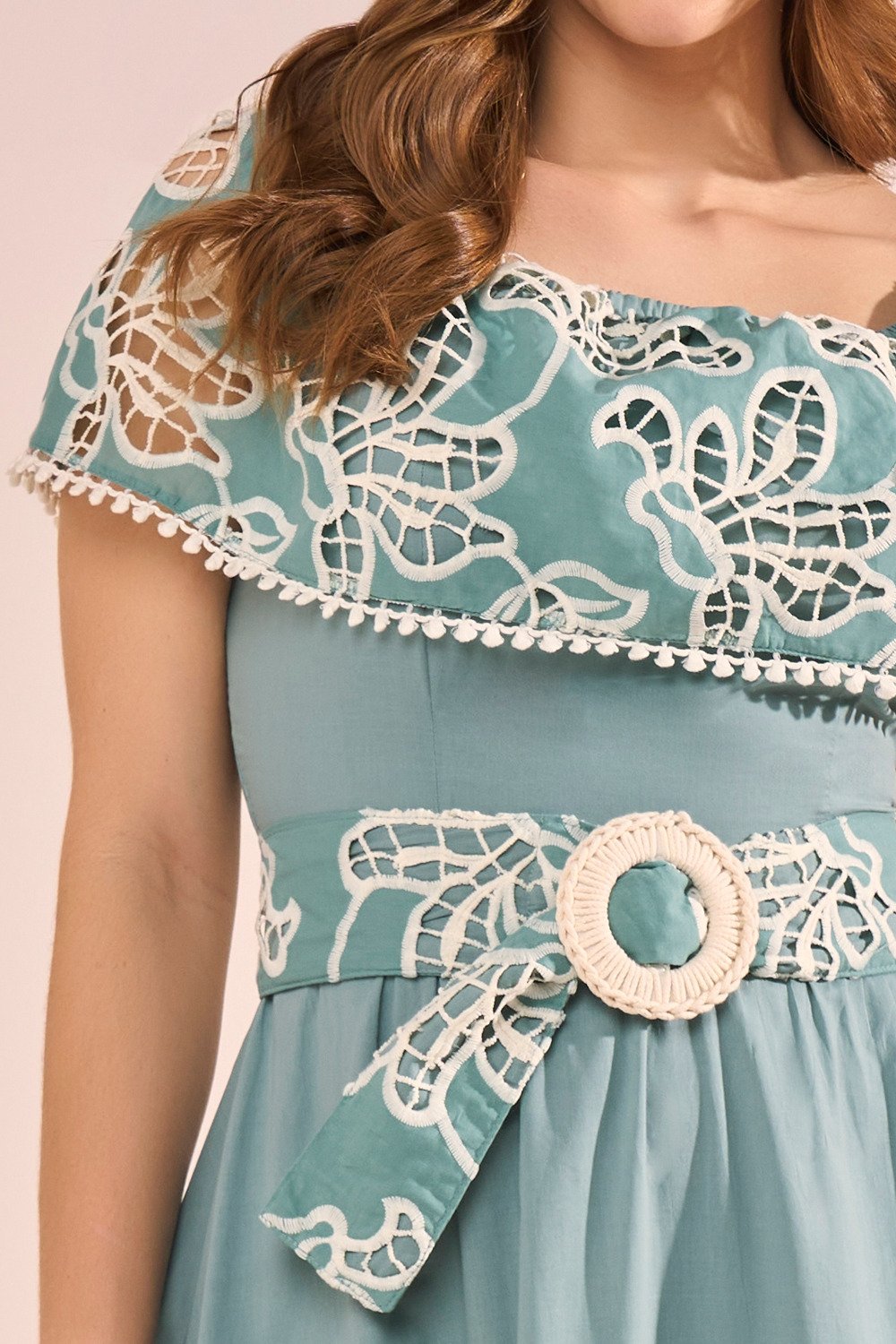 Os bordados Richelieu e o guipir trazem um toque artesanal exclusivo. O decote ciganinha realça o colo e os ombros com delicadeza. O cinto faixa com fivela adiciona versatilidade à peça. A modelagem godê garante feminilidade e caimento impecável.