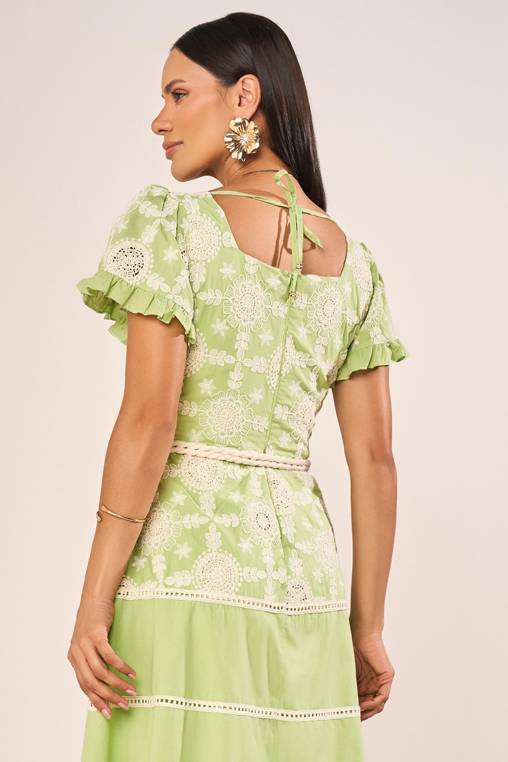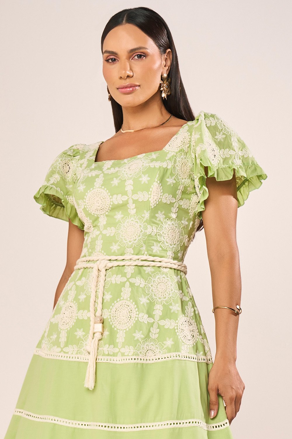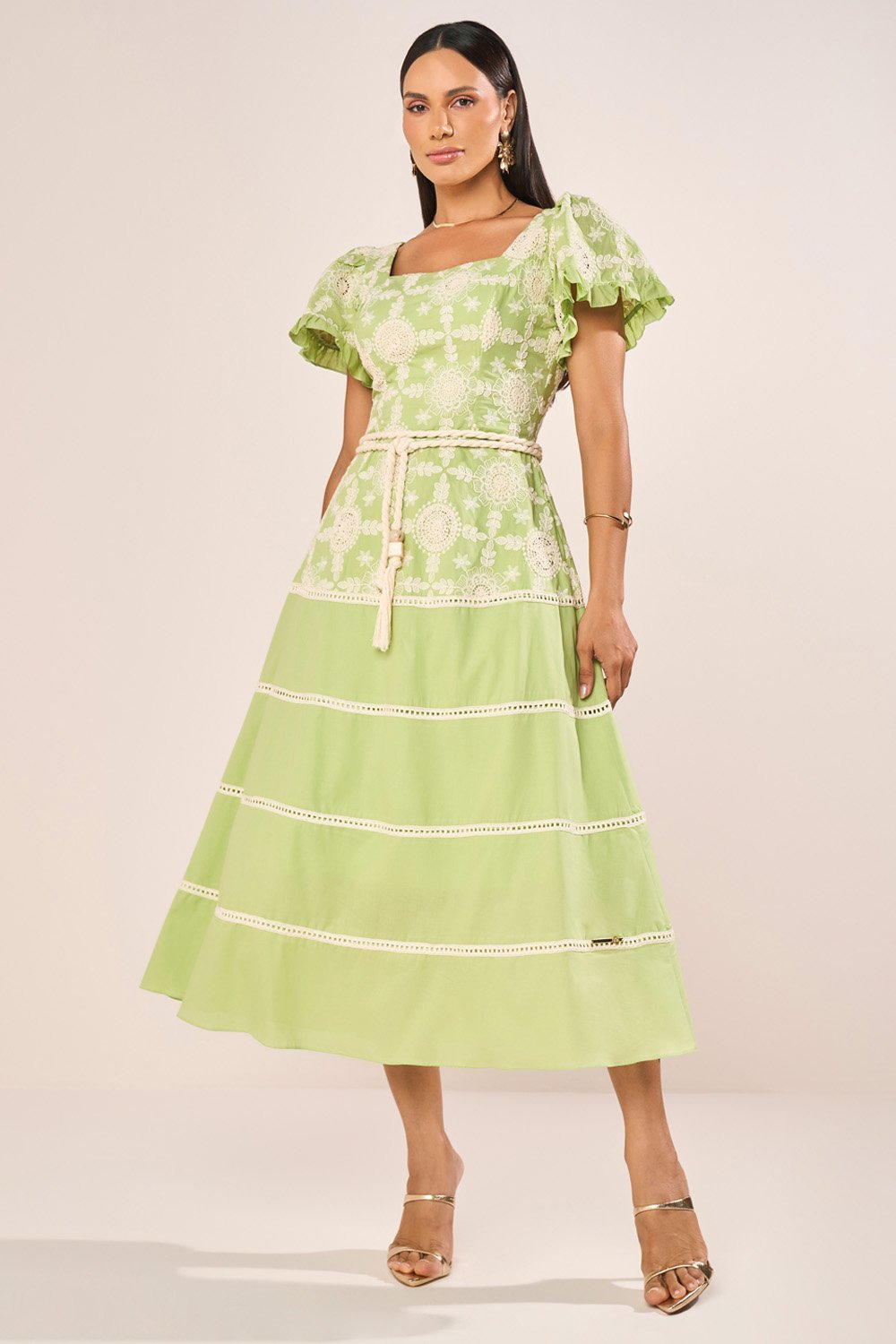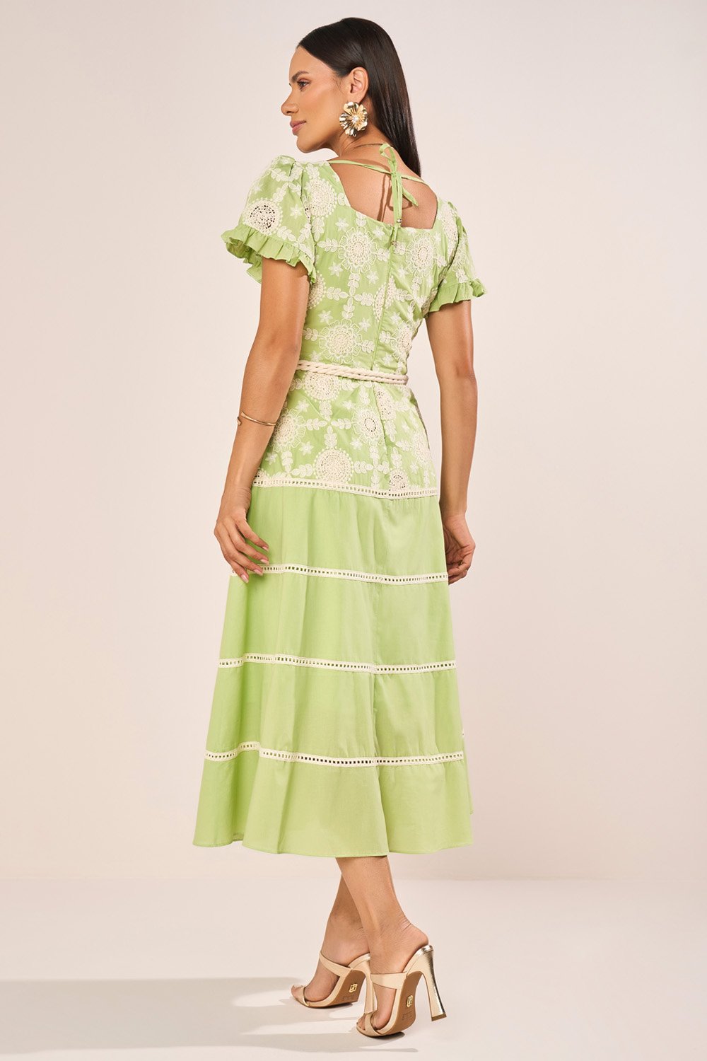 O algodão utilizado nesta peça oferece uma sensação de frescor e maciez, tornando o vestido ideal para dias quentes, sem abrir mão de estrutura e caimento harmonioso. Sua textura natural realça os bordados, permitindo que cada detalhe se destaque com nitidez e delicadeza. A fluidez suave do tecido favorece o movimento das marias da saia, garantindo balanço gracioso sem perder a presença estética. O forro interno proporciona discrição e conforto absoluto, mantendo o acabamento externo impecável durante todo o uso.