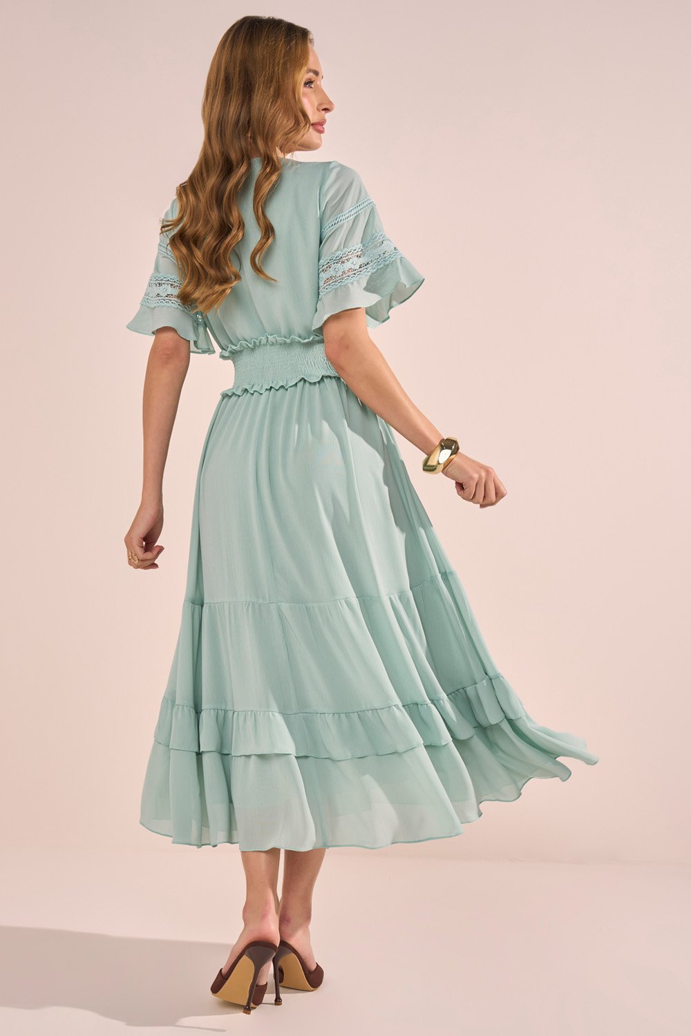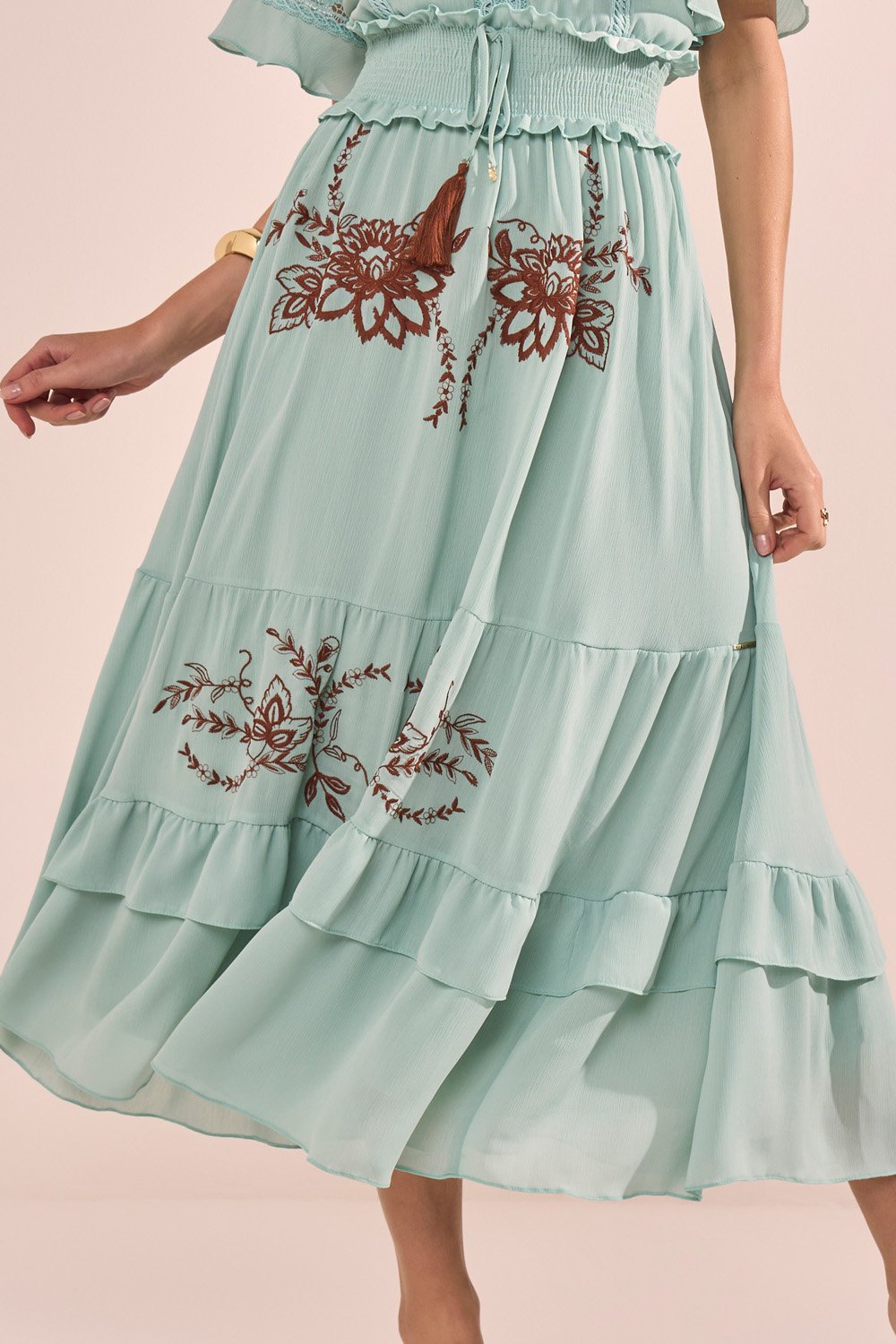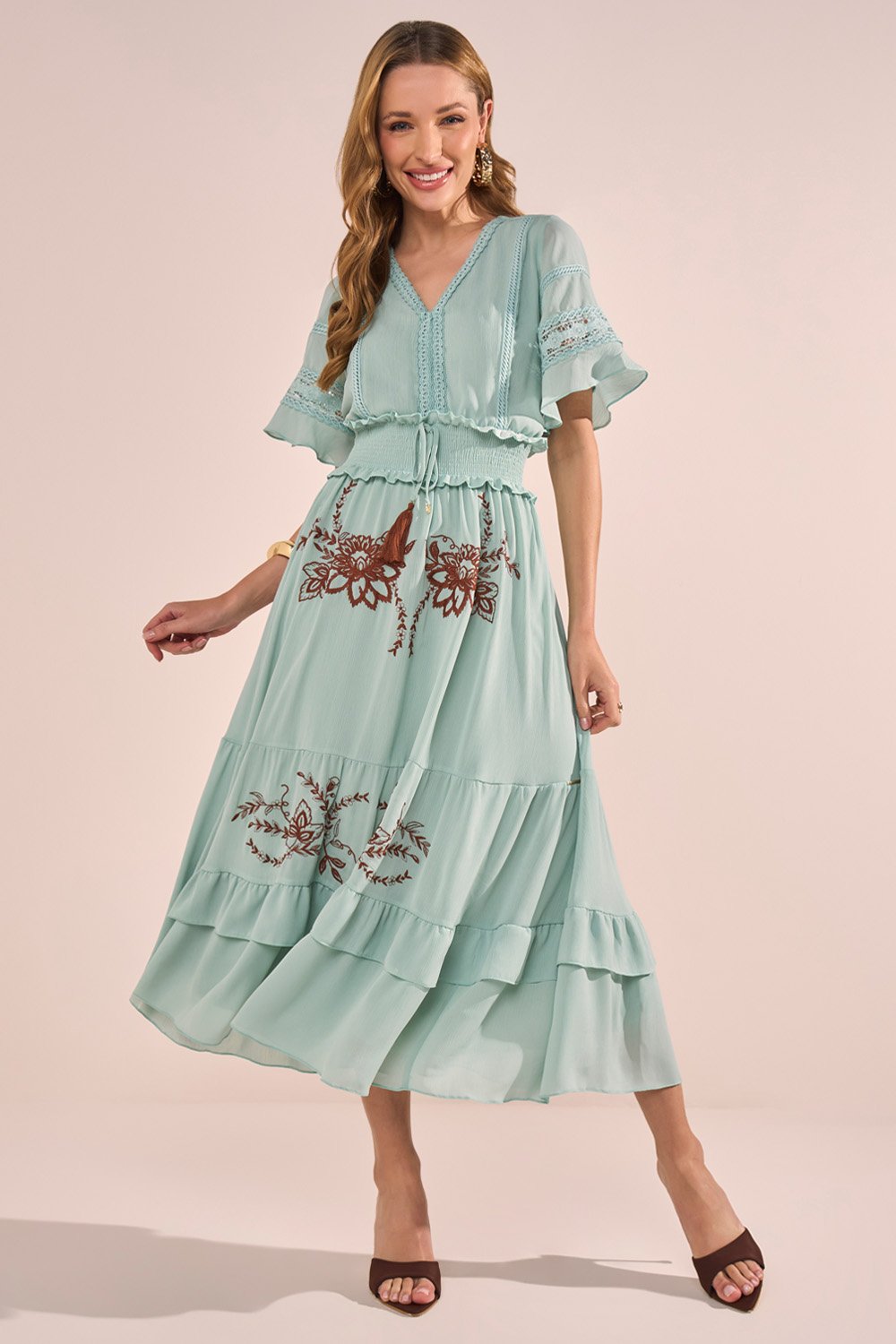 -40%FRETEGRÁTISENVIOIMEDIATOVestido Marrom Estampa Floral Com Babados Evasê Midi Fasciniusde R$ 699,90 porR$ 390,54 no PIX