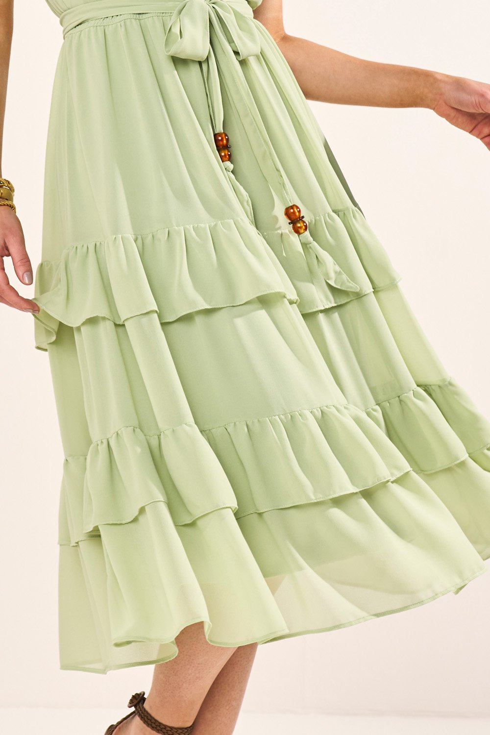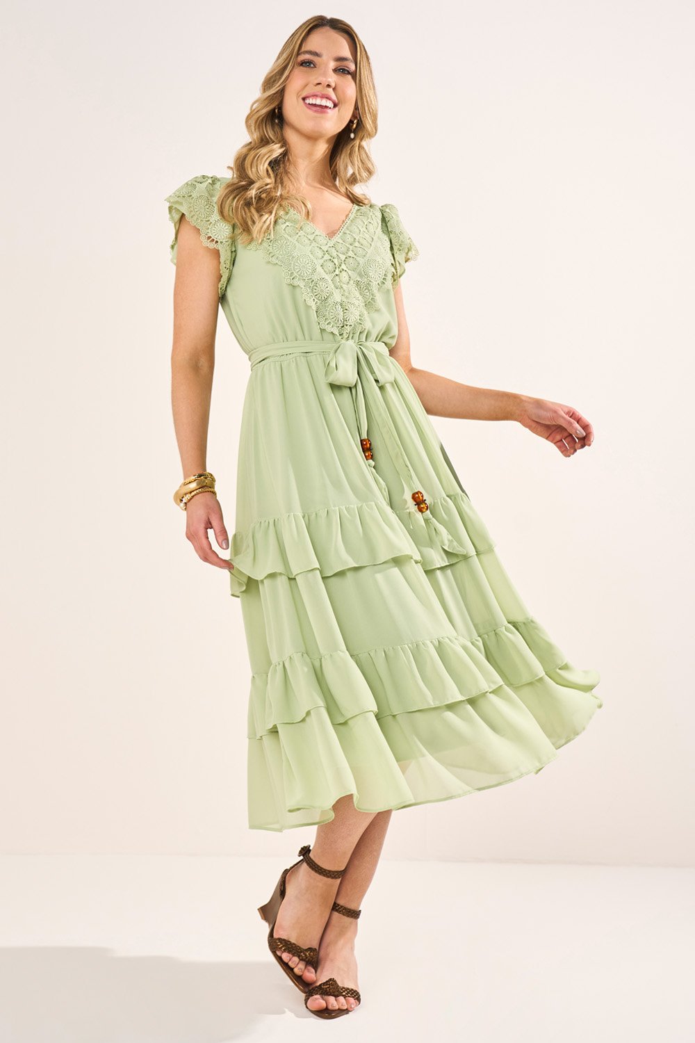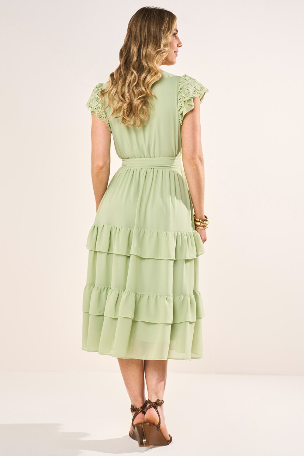Este vestido em crepe é leve, fluído e sofisticado. O decote V alonga a silhueta, enquanto as mangas cute reforçam a delicadeza do modelo. O cós com elástico garante conforto, e a saia com babados adiciona movimento encantador. Acompanha cinto faixa com ponteiras de resina, que valoriza a cintura e completa o visual.