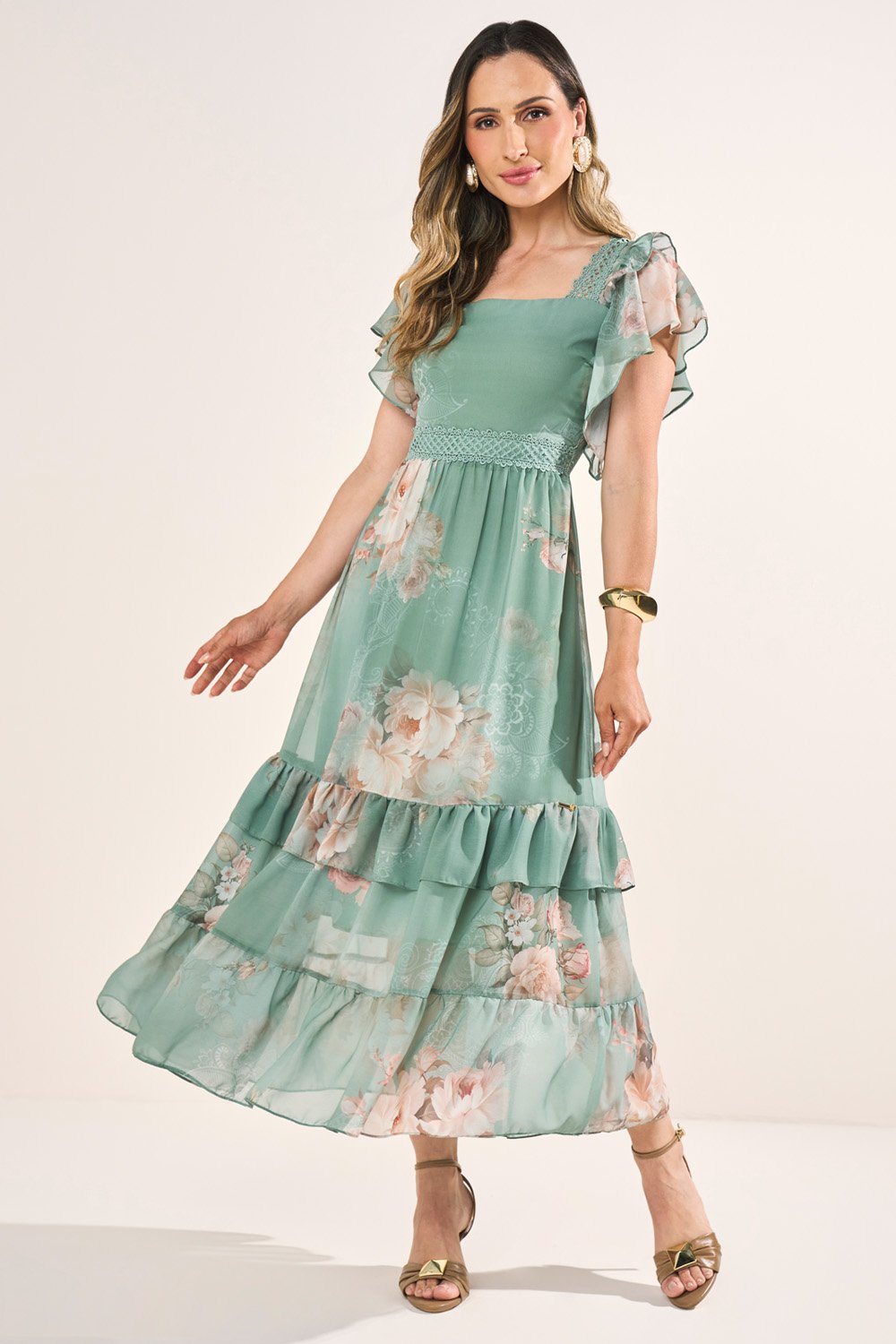 Este vestido em crepe com estampa floral exclusiva da Fascinius é delicado e sofisticado. O decote quadrado é atemporal, enquanto as mangas evasê oferecem fluidez e romantismo. Os detalhes em guipir enriquecem o visual, reforçando o caráter artesanal da peça. As costas contam com lastex e amarração finalizada com ponteiras de metal, garantindo charme e conforto.