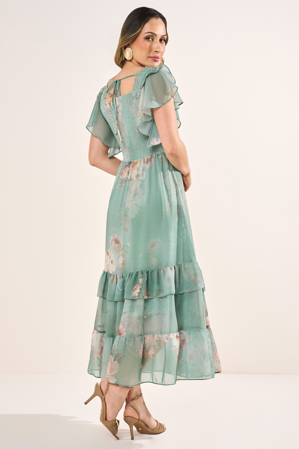 Os babados aplicados na saia reforçam o romantismo e a delicadeza do modelo. O lastex nas costas garante ajuste perfeito ao corpo, enquanto a amarração com ponteiras de metal adiciona acabamento sofisticado. Um vestido único, que traduz feminilidade e exclusividade em cada detalhe.