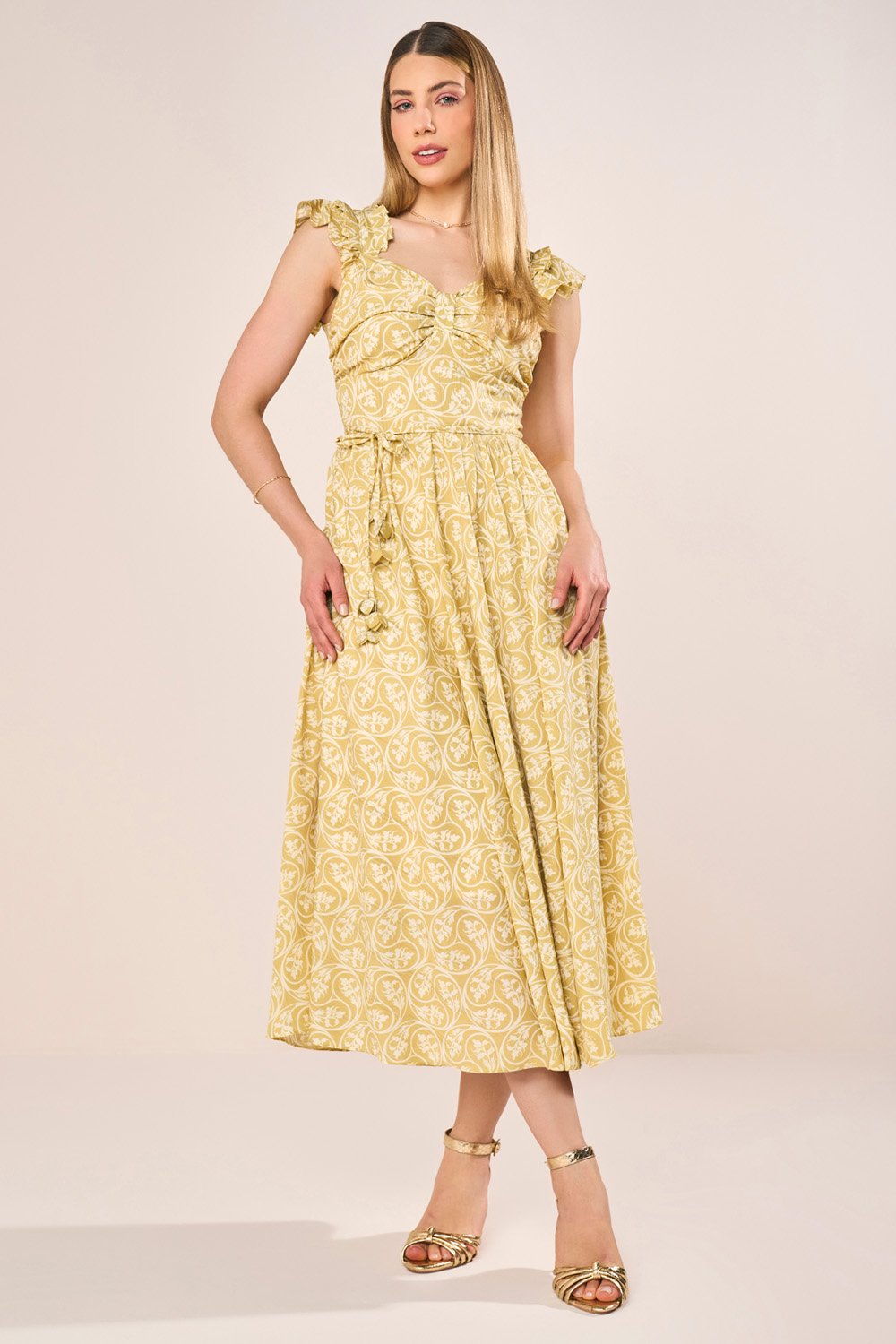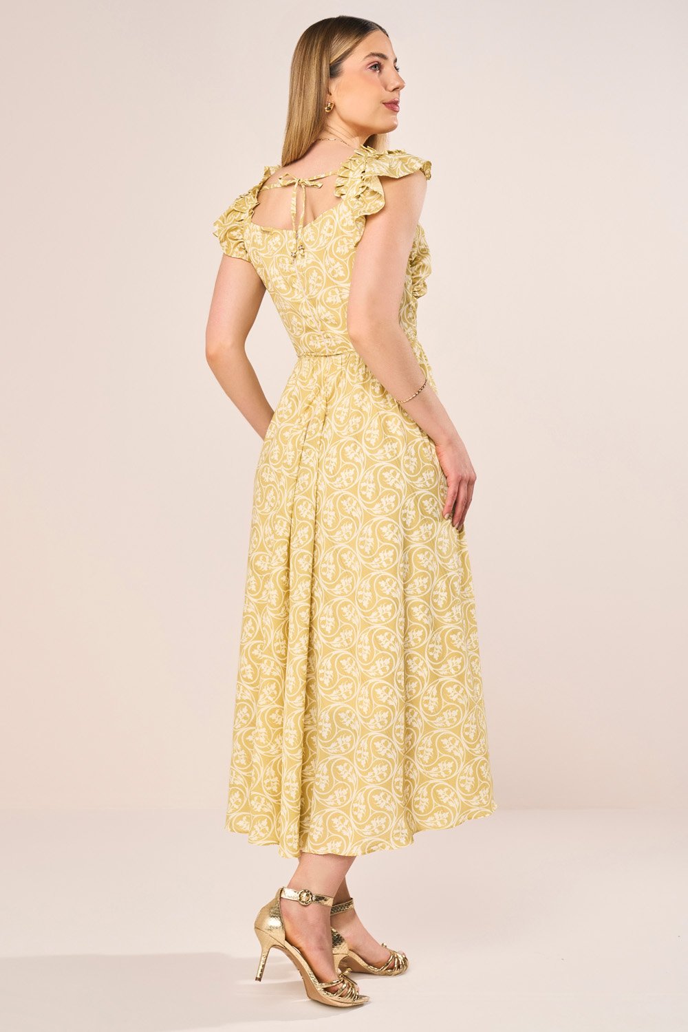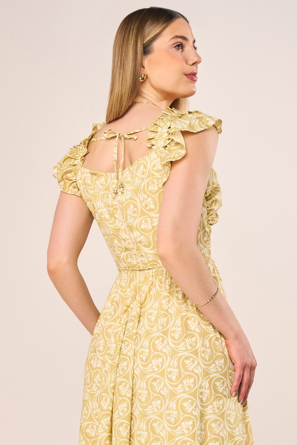 Confeccionado em crepe estampado, o tecido possui textura suave, caimento fluido e excelente movimento, ideal para evidenciar o godê da saia. Seu toque leve garante conforto ao longo do uso, enquanto o forro interno acrescenta segurança e acabamento impecável, mantendo a estrutura do vestido sempre elegante.