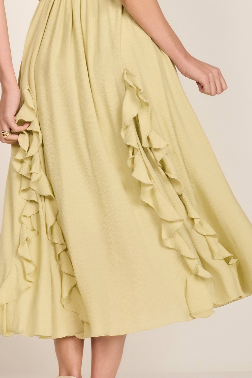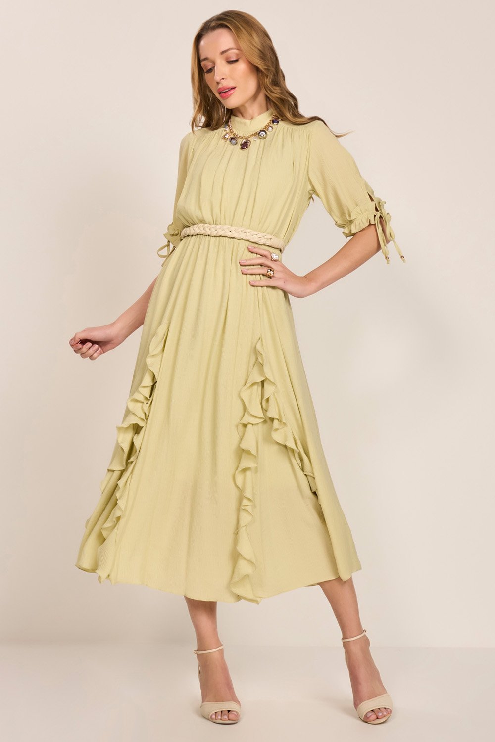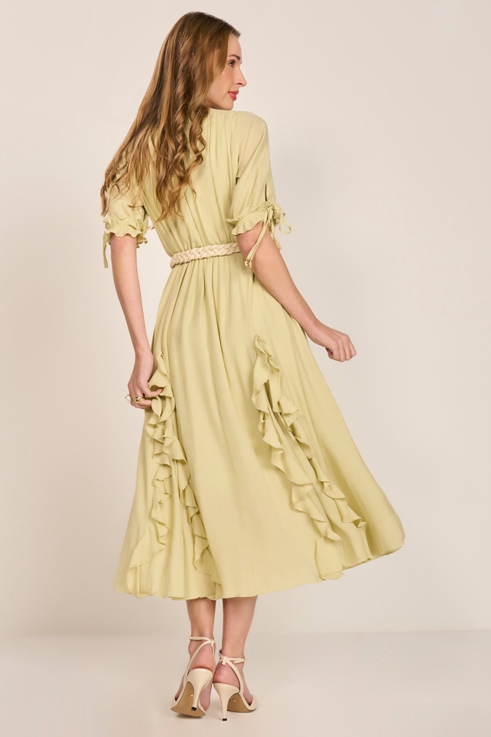 Romântico e fluido, este vestido destaca-se pelos detalhes delicados e estrutura leve. Possui mangas levemente bufantes com punhos elásticos, abertura com amarração e ponteiras de metal que adicionam charme ao visual. O busto com drapeados valoriza a região do colo, enquanto o cós com elástico e a saia em nesgas com babados proporcionam movimento e elegância. Não acompanha cinto.