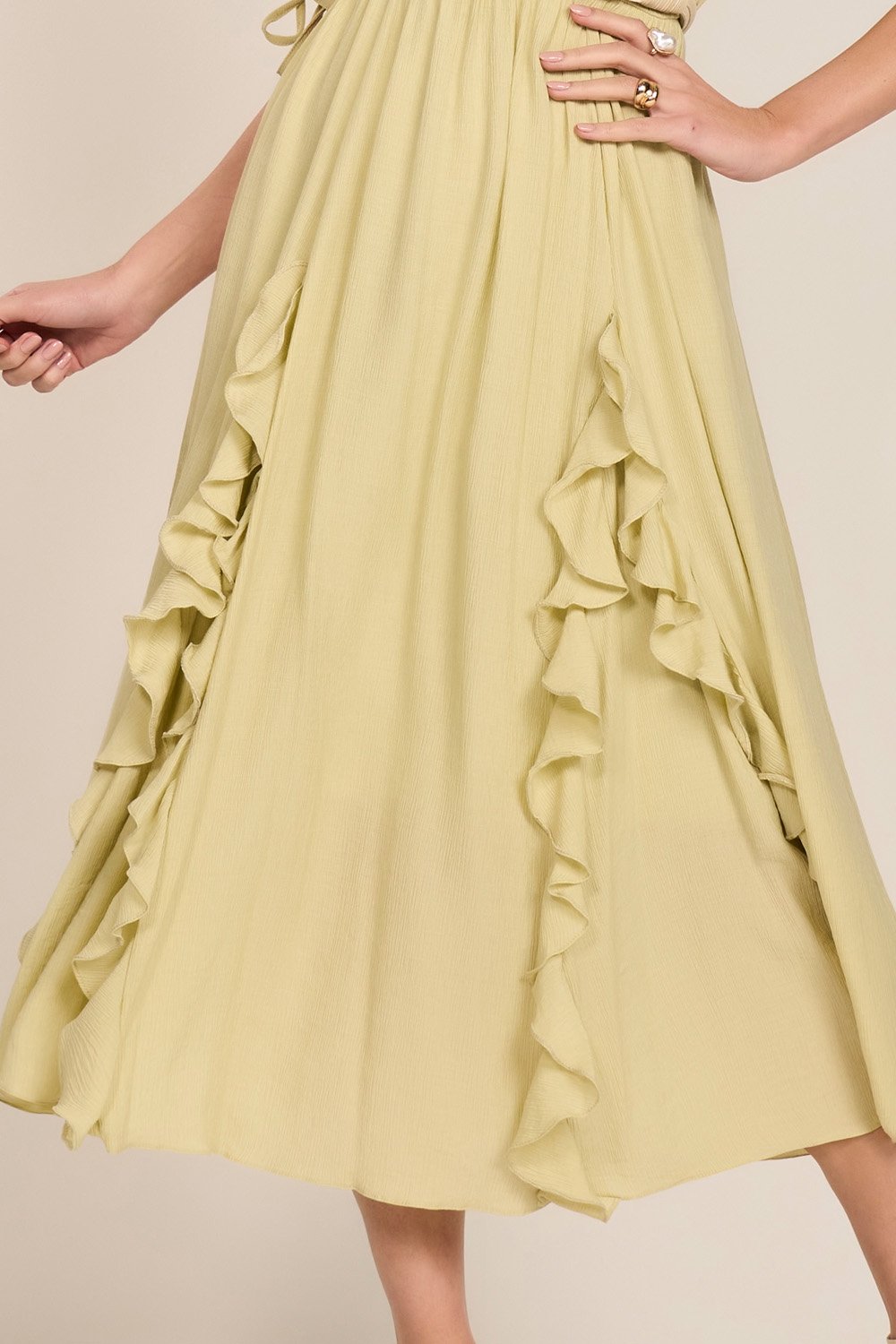 O equilíbrio entre os babados, os recortes e os drapeados resulta em uma peça sofisticada e feminina. A amarração no decote com ponteiras metálicas confere um toque moderno e diferenciado. Um vestido pensado para mulheres que valorizam estilo com delicadeza.