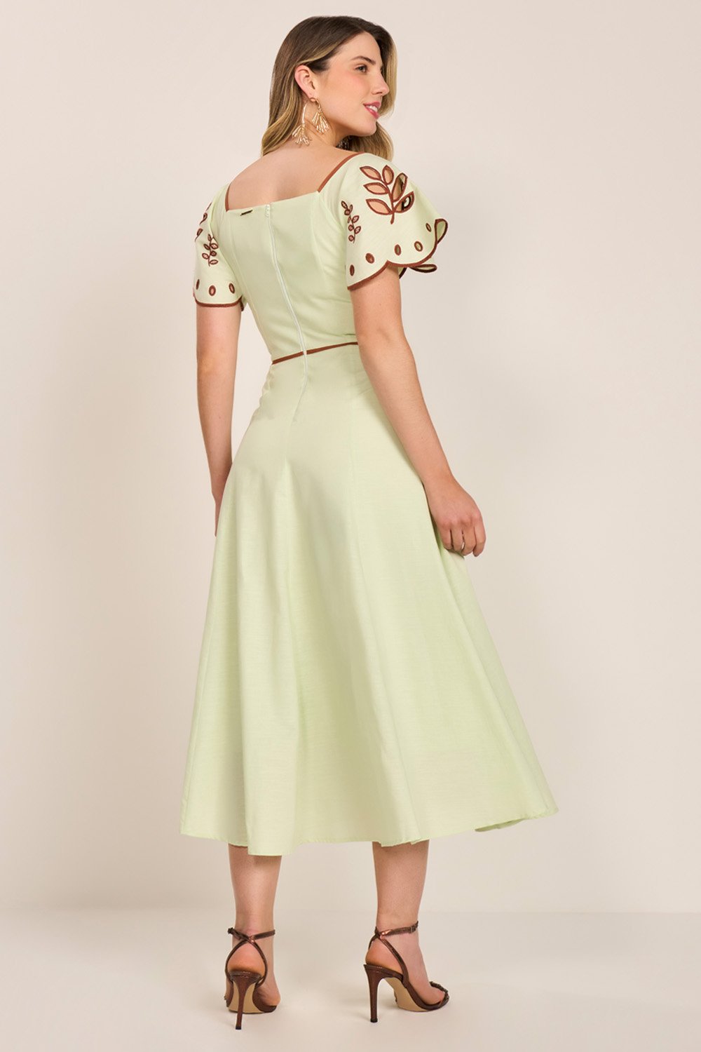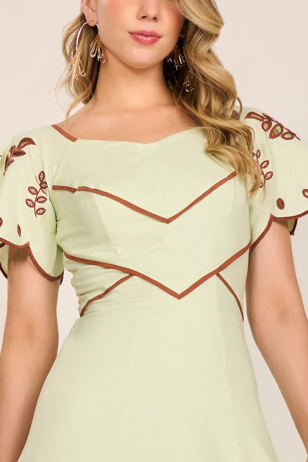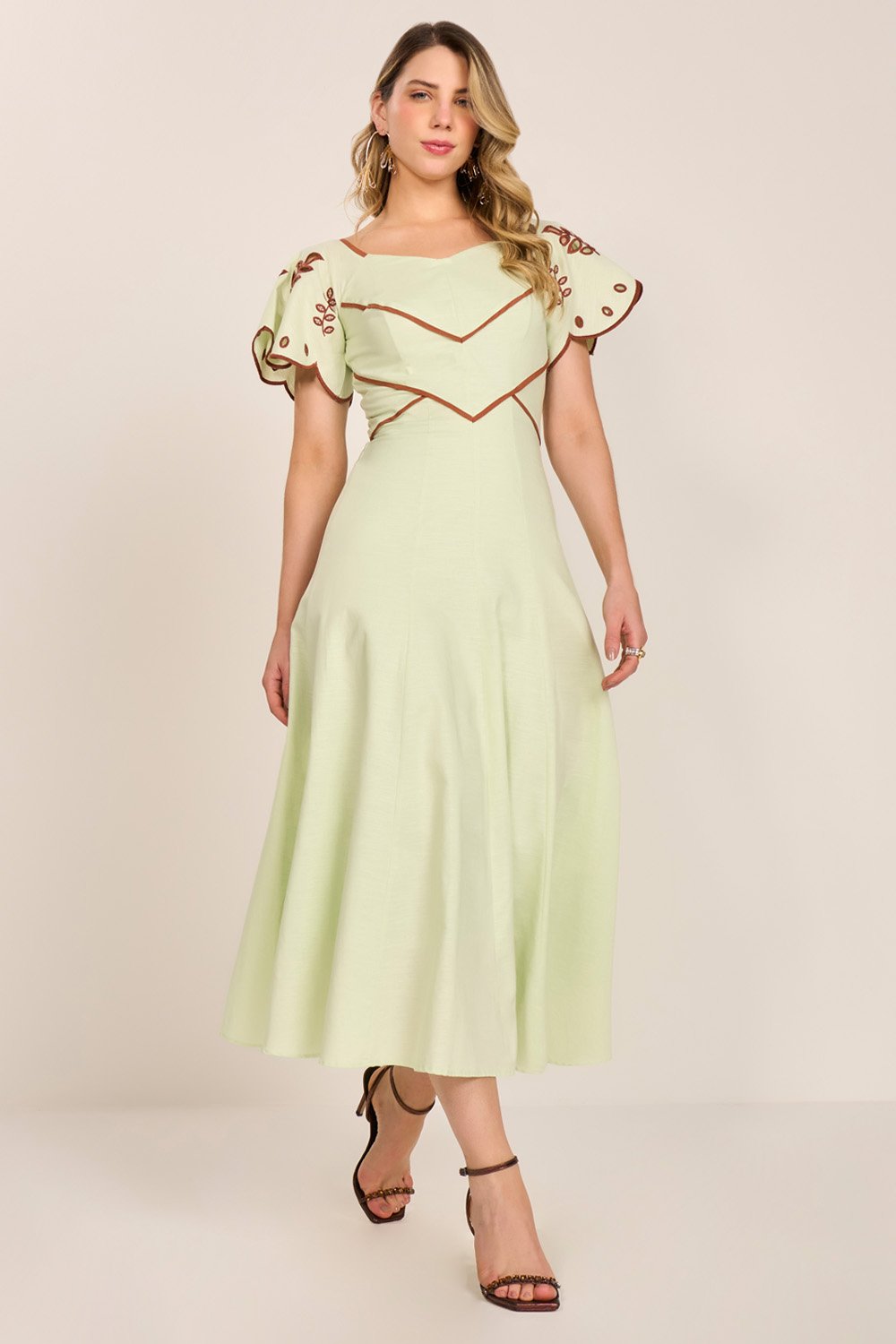 Elegante e cheio de personalidade, este vestido traz uma proposta charmosa com seu decote princesa e recortes que valorizam a silhueta. As mangas evasê ganham destaque com bordados richelieu em duo colors, criando um visual sofisticado e ao mesmo tempo leve. A saia em nesgas proporciona movimento e feminilidade, resultando em uma peça versátil para ocasiões especiais ou compromissos importantes.