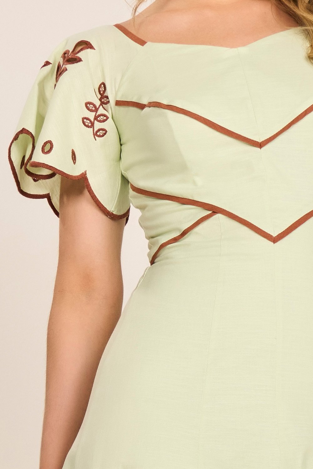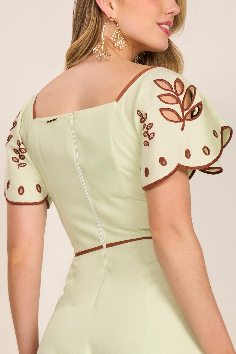 Os bordados em richelieu duo color elevam o nível de sofisticação da peça, transmitindo delicadeza artesanal. Os vivos aplicados no corpo destacam os recortes e valorizam ainda mais a modelagem. O zíper posterior garante praticidade ao vestir. Uma escolha elegante e única para quem busca exclusividade com beleza atemporal.